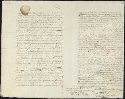 van Koper Tin, bedde Linde en wollen, kassen, Taeffels stoelen en banke) alles wes tot eenen Imboedel behoort, en dat niets ter wereldt uijt¬ daar aan gezondert, zoo verre hij Comparant eenigh het alderminste reght is hebbende ende nauwkeu= righ bij hem transportant en de voorschr getransporteerdens is opgenomen en getax¬ geert en eijndelijk nogh allen de graene van Tarwe, Rogge, haare boekweijt en saat, dewelke vooren van een jaar off saijzoen onder dat juiste jaar te bepalen, en gevolglijk de ’tzelve volle Jaar oogst te verkiezinge en keure van de getransporteerdens te velde zullen wesen en bevonden werden op gelegen Diversche parcheeltjens van Erve onder Oosterhout ter nombre van omtrent twintigh loopenzaat, allen het voorschrevene wettigh getransporteerde naar exacte calculatie van henlieden ten uijtterste en hooghsten weer digh, de somme van vierhondert en vijfftig gul¬ dens Hollandts, en zulks alles in volkomene voldoeninge (soo verre het kan strekken) van alle Dienste, kneght, en meijt huere, die hij Frans¬ omtrent postant, een man van 10 jaren oudt zeedert meer dan aght jaren herrewaarts bekende en deklareerde van sijnen voorschreven zoon en dogter genooten gehadt en ontfangen te hebben en welke zoo hij zeijde meerdere somma van penning waren beloopende, renuntieerende en verthiende overzulks van allen het voorn: getransporteerde gants en al ten doene ende behoeve van de voorn:e Cornelis Peeters en Johanna Peters van den Rie= boom, zonder daaraan meeste hebben ofte te behouden eenigh het allerminste reght actie offte gezagh in Eenige maniere zulks de ge¬ transporteerdens allen ’tzelve ten allen tijde zullen konnen en moogen aanslaan, als haar vrijen eijge= goedt zonder bekreun offte tegenzeggen van imande en datzelve van den anderen kant geheel een gedeelte van dien aan den Transportant precario zullen konnen late bezitten zoo lange het gene goeden Raadt en gelieffte gedragen zal, in welke geval hij comparant blooffde niets te zullen ver¬ minderen deterioreren, offte verslimmeren, belooven, de dezelve Comparant deeze in allen deelen te zullen maar koomen presteren en onderhouden doen naar¬ koomen en onderhouden, Onder verbant, bedwaak en Executie van sijn persoonen onroerende goederen als naar reghten ende Compareerde meede voor ons Notaris en getuijgen de voorn. Cornelis ende Johanna Peete van den Rieboom getrans¬ porteerdens in deezen, ende verklaarde het voor¬ zeijde getransporteerde in voegen voorn. als nu nogh nade t’ accepteren, en daarmede voor zoo vore voorschreve te nemen contentement ende genoegen, delibererende mitsdien tezelve sake den Transportant van alle verdere aantaal, zon¬ ijder deswegen eenige actie tegens hem off sijne Onroerende goederen de gereserveert te houden demitterende kenne meerdere pretensie gratissen sijnen in consideratie van hen Hoogen Ouderdom en loo¬ beren staat, Bloovende in ’t haere deeze meede te zullen naarkomen en presteren onder verbandt bedwank en executie als vooren Aldus gedaa¬ getransporteert en geaccepteert binnen dongen voornoemt op heeden den 12e December 1735 te presentie Wouter Vermaas Mr. Cleermaker en Niklaas Dircx beijde in¬ woonders als getuijgen hier toe versogt Peter Jansen vanden Kieboom dit nevenstaande is ’t hantonder van den eerst getransporteerde Dit nevenstaande is het kantmerk vande tweede twee getransport Wouter ver Maet laast Mij Toirconde Adr Sem Nots: