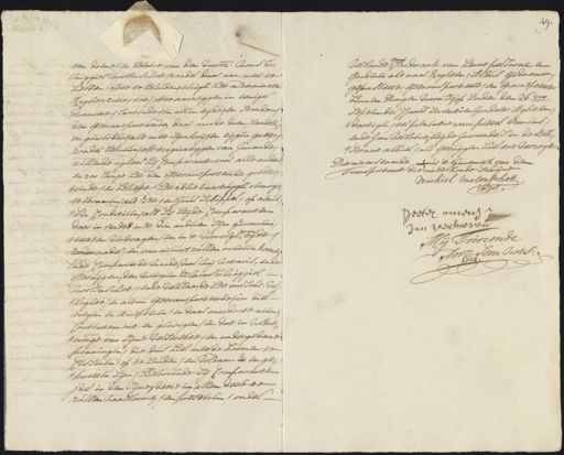 ten doene en behoeve van den voorsz: mons Mighiel moolenschot zonder daaraan meer te hebben offte te behouden eenigh het alderminste Reght actie toe, offte aanzeggen in eenige maniere, laatende ten allen tijde en stonde, den getransporteerden daarmeede doen, handelen en gewerden, als met sijn vrijen eijgen goet zonder bekrum, off teegenseggen van imande zullende eghter hij Comparant voor alle andere en zoo lange het den getransporteerde goedt vindt en beliefft hetzelve vaartuijgh vermogen te bevaaren, als het ten huur schipper op alzul= het conditien, als sij beijde Comparanten daar in reedts met den anderen sijn geconveni¬ van eeten verdragen en in ’t vervolgh tijdt nader en van nieuws zullen overeenkoomen ende Compareerde meede voor mij notaris ende getuijgen den meergem:en Mons: Mighiel Moolenschot, ende verklaarde het voorsche ver¬ koghte en als nu getransporteerde in die voegen te accepteren, en daarmeede te neemen contentement en genoegen en dat in voldoen ninge van sijne verstrekte en ondergedane penningen, die dus hier meede koomen te cesseren op te houden en voldaan en ge¬ weeten sijn, beloovende zij Comparanten ider in den sijne deeze in allen deele te zullen naarkoomen, en presteren onder en verbandt, bedwank van henne persoonen en goederen als naar reghten, Aldus gedaan gepasseert, getransporteert en geaccepteert binnen dongen voornt op heeden den 26en September sjaars seventien hondert stakten, dartigh ter presentie van Pieter Domens, ende Jan Verhoeve beijde Inwoonders in de kerk straat alhier als getuijgen hier toe verzogt dit nevenstaande is ’t hantmerk van den Transportant die niet konde schrijven Michiel Molenschott 1638 Peeter oneren Jan Verhoeven Mij Toirconde den nots: 1738