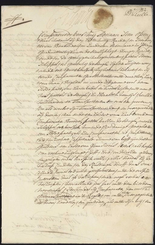 752 Brielle de Compareerde voor mij Adriaan hem open= baar notaris bij den E: Moog: Raade en eenhoo= ve van Brabandt ten lande van Overmaar in slage geadmitteert binnen de hoorlijkheijt dongen Rezide= rende en de getuijgen naargenoemt pieter stoom schipper en Geertruij de Hoogh Eghteluijden woo nende tot Groot waspik mij notaris bekent en sij tweede Comparante geadsisteert met denzelven haaren man doghter en meede Erffgename voor een sesde part van haren vader en moeder wijlen met namen van Peetes de Hoogh en Elizabeth vermeijs welke verklaarden te Transporteren en over te geeven zoo als dezelve sijn Transporterende en overgevende bij deezen, aan ende ten behoeve van haar tweede Comparante Broeder Peeter vallen de Hoogh meede schipper tot was pit woonende zoodanige gereghte een sesde part als hen Comparanten is competteren de in zeekere cappitaale somme van vijffhondert guldens ten laste van Fransistus Attel, als kooper van zeekere huijsinge hoff, Erve en driessen gestaan en gelegen onder Waspik voorsz: alles breeder bij de verkoop Conditie en den kustingh brieff daar van zijnde swaartoe wert gerefereert met de resp:e intresten daar op verloopen ende nogh verder te verloopen, vervallende de jaar met den vierden november stellende sij Comparanten den voorsz. dit getransporteerde in ’t verreght om met vergegeven te doen, handelen, en gewerden als met sijn vrijen