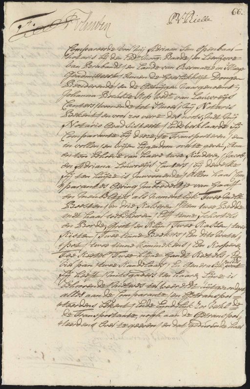 66. PV Rielle vanden Compareerde voor mij Adriaan hem openbaar Notaris bij den Eede Moog: Raade en Leenhoove van Brabandt en Lande van Overmaze in ’s Hage Geadmitteert binnen de heerlijkheijt dongen Reziderende, en de getuijgen naargenoemt Johanna Rocusse Kop wed:e van Lauwris Canters woonende tot smoes, mij Notaris Bekenten voor zooverre des noots met hij Notario geadsisteert ende verklaarde sij Comparante bij deeze te Transporteren, en in vollen en vrijen eijgendom over te geven, aan en ten behoeve van haere twee Kinderen Jacob en Adriana Louwrens Canters, bij dewelke sij ten huijze is inwoonende allen haar Com¬ parantes gering Imboedeltje van haaff en meubeltjes als namentlijk Twee melk Beettens en drie kalveren, Item twee Bedde met haar toebehooren, Elff tinne schootels en Borde Groot en Klijne Twee kassen, twee kisten Twee tinne beekers, Een dito water 4 pot twee tinne kommekens, Een kooperen Tee keetel, Twee klijne handt keetels, Een valles vier pan twee Kandelaars, en generalijk wat sij heeft mitsgaders ten haaren lijve is behoorende nietwes te weereldt uijtgezonden alles aan de Comparante, en getranspor= teerdens bekent, Ende eijndelijk zoo verkl: de Transportant nogh aan de getranspor= teerdens over te geeven, en dat gedurende haer