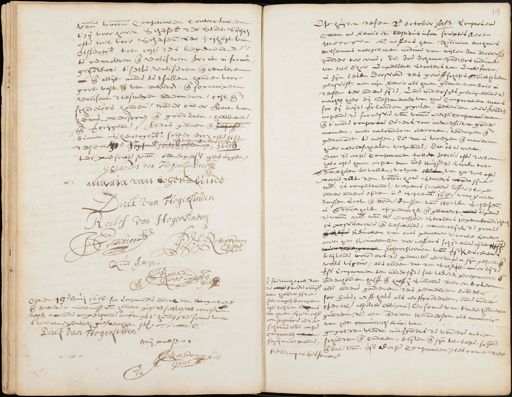 van voorn. Comparanten contractanten tsij voorheeren Schepen der stadt boven ofte wel voor schepenen vrijheijt van gisters tot coste des begerende te renderen ende valiseren prout in forma gehorende tselve valiseren ende renoteren nu ende altijt mede te sullen houden voor goet vast ende van weerden, ende soodanigen realisant dieswegen indemneren, cost ende schadeloos houden weder onder verbant van henne persoonen ende goederen, hebbende gecopieert ende vercrijgende, Aldus gedaen ende binnen Shertogen. sonder erch ofte list „ ende voltrocken den 13e. Junij desen 20en. Septemb. 1683 ende geschent 1688 ter presentie vande ondergess. getuijgen Gerardus van Hoger Linden maria van hogerlinde Dirck van Hogerlinden Roelof van Hogerlinden in 1 J: Rotten 5 Quod Attestor sterdam 10 1686 Pub opden 19en. Junij 1646 soo Compareerde Dirck van Hoogerlinde ende bekende in mindernisse van de hondert gul. denselven uut crachte van desen accoorde competerende ontfangen te hebben de somme van tweentnegentich gul derthien stver oirconde Dirck van Hogersien mij presentie Jan Nots. 1616 Op huijden desen 2en october 1683. Compareren Cramme. Notario et vestibus infra scriptis aen moors ende neffens hem Thilemina Anthonis Hellemans naergelaten weduwe van wijlen Jan adriaensz redder ter eenre, en Joe Johanna Vedders weduwe van salr. d'heer Engelbert Stooters van Enckfort in sijn leven Drosaerd des graeffschaps Bockhoven geassist. met mijn Notario als haren gecoren momboir in desen ter andere sijde, Ende wedersijts gebruijckende machten haer bij Testamenten van hare comparanten man soo sij beijde verclaerden gegeven, bekenden ende verclaerde novende de successie van de voorn. eerste comparante man ende tweede comparante Ouders, door intercessie van goede mannen, met malcanderen overcomen, verdragen ende geaccordt te wesen, ende dat in voegen ende manieren hier naerbeschreven volgende, dat is te weten dat de eerste Comparanten totte portie ofte deelen haer ofte haren eersten man in den huijse de Swaen tot Bockhaen bevallen, volgen salle van het deel opt portie met den voorn. hare stooters noode sijne we. is competerende, volgens seeckere Erffdeelinge onder andere op den iie. Septemb. 1640. voor Peete Janssen Crol ende Hendr. Janssen van de stoeten schepen in Bockhoven opdracht ende gemaect ende tgeen de voorn. wed. vanden Drossard Stooters jegenwoordich is possiderende ende besittende, namentlijck de groote ende sijne keucken van outs genaemt de wale kamer met het keuckensen daer neffens schijdende op de res¬ men schoorsteenen vande voorss. keuckens schijvende voorders de gemelte deelinge in sijn geheel volle vigeur, als alleen dat den schepte muer bij de voorss. Comparanten ten wedersijde sal werden gerepareert ende onderhouden halff ende halff sullende daeren boven alle andere goderen des gemelten boedels soo have, erff hare als erffgoederen ende mede special. alsulcke obligatie, ter somme van twee hondert gulden, die aen Adriaen ste indersom als momboir van het onnodich kint van gegoeden werdt mitsgaders de vordere actien schulden ende crediten, blijven ende sijn tot laste schade ende bate vande voorss. Eerste Comparanten, dies come daer soodanich oock dat de de tweede comp. van haerder sijde sal mogen brengen ofte leijden ans tot haren eigen cost een schouwe inde schouwe van de eerst comparanten in scheijmaer staende tie te mijne helfemans