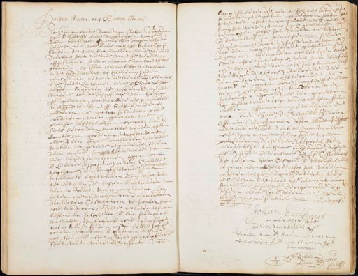 Inden name ons Heeren Amen soo Compareerde voor mijn Johan Rotterdam Openb: Nots. ende de getuijgen naergen. Johan Eeckhout in wonende borger alhier ende marte van Boer, wettige houwelijcx lieden, de welcke overdenckende e ende daeromme niet willende van dese werelt affscheijden, sonder alvorens van hare tijdel. goederen by Godt Almachtich verleent ende gedisponeert te hebben, inden eersten dan bevelende hunne zielen ende ende de doode Lichamen eerl. ende Christel. tot aerden begraven te werden, comende vorders tot de dispositie van hender voor goederen, soo meubile als immeuble mitsgrs: haeff erff halff ende andere goederen, als actien schulden ende crediten, waer offte tot wat plaetse deselve zijn ofte oocq eenich sints bevonden mochte werden, egeen soorte van goederen wtgesondert alle ende een eijgel. derselver latende makende, gevende ende gund ende een den andre langhstlevende van hen beijden in volcomen ijgendom ende libere dispositie, onder Conditie niet alleen noghtans, den langhlevende sal schuldich ende gehouden zijn, daer ut te betalen, de lasten ende schulden van Hennen boedel, maer oocq daer en boven te onderhouden ende alimenteren derselver Testateuren te samen kin ofte kinderen, deselve te laten laeren lesen en schrijven, ende een soodanich ambacht, hantwerck ofte exercitie waermede sij den cost eerl. som¬ connen winnen ende gecomen zijnde tot houwel. ofte andere geapprobeerde staet, met wete ende consent van langhstlevende aen t selve kind ofte kinderen te geven ofte doen soodanige int settel ofte recognitie als deselve langstlevende, naer sijne qualiteijt op vermogen selfs sal vinden te behooren ende dat alles in plaetse vande selver Legitime portie, sonder nochtans dat den langhstlevende gehouden sal zijn aen niemanden te leveren eenige staet ofte Inventaris veel min reecken ofte beweijs te doen, als sulx malcanderen remitterende, constituerende d’een den anderen langstlevende als momb: ende vooght ofte vooghdesse over henne voorss. kint ofte kinderen met soodanige adjouckt als den gemelten langstlevende ist nood, tot hem sal willen assumeren, secluderende tot dien eijnde d’ Ed: aghtb: Heeren Officier ende schepenen deser stadt mitsg. die alle andere het recht van Momboir ofte oppermomboirschap soude willen pretenderen, derselver respect ende een weerdicheijt nochtans behoudende ’tgene voorsz is, seyde ende verclare de voorss. Testateuren te wesen haer Testamt ende wtterste willen begerende selve alsoo sal werden achtervolght ende geobserveert, tsij als Testamt. Codicil ende alwaert oock soon als deselve derogerende by desen, aldus de desen 27en april 1683. ter presentie van ondergess. getuijgen Johan Eeckhout maria eeck hout man van Wasbeeck Signum van Jan Michiels van Sleewijcq vercle niet te comensch Ita attestor J: Rotterdam Nots. Pub