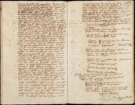 daar op staande ende uijtgaande, verthiende de voorn. Condividenten bij namen ende qualiteij¬ als voor op iegelijcke portie bij deser offdielinge ende erffscheidinge te deel gevallen, gelovende sonder danten voorn op verbant van hen persoonen ende goederen, present ende toecomende t'voorschreve Erffscheiden, ende verthijden nu ende altijt vast, bedick ende van werden te houden ende doen houden, sonder eenich tegenseggen in recht ofte daar buijten ende allen Commer, Calangie ende aantal van hennent wegens ofte andersints daarin nu wesende, malckanderen reciproquelijck aff te doen geheelijcken, Ende oft gebeurden, dat iemandt met recht eenich doeck over de voors parceelen hadde, sullen sij Condividentie de selve moeten laten wegen na behooren mits conditie dat de voors Condividenten ider sijn aangedeelde lasten voortaan alsoo sullen moeten gelden betalen afflossen ende duiten, dat d’een door des andere wanbeta¬ linge, faulte ofte gebreecke geen schade come te vervallen, maar soo naarmaals met wege van recht bevonden worde uitte geloote ende verdeelde goederen meer lasten te gaan, anders dan huer vooren is begroot soo beloven de opgemelte Condividenten alsulcke meer bevonde lasten malckanderen te helpen dragen, resonderen ende goet dan ider voor een gerechte vierde part gelijck de voors Condividenten dat alsoo opentlijck hebben bekent ende beleden, tot prompte voldoeninge ende preestatie van allen t'gene voorsz is, verbinden de voorsz. Condividenten hinc inde weder hare persoonen ende goederen hebbende ende vercrygende Constituerende ten meerderen effecte van allen tgene voorschreeve is alle eerste thoonderen deses om de voorschreve acte van offscheydinge ende deilinge ende alles wes daar bij gestipuleert ende belooft is, t sij voor haren schepenen der Vrijheijt Oisterwijck ofte Bosch te realiseren ende 59:0: vernieuwen pro ut moris et stil, sullende tselve altijt van weerden houden ende soodani¬ gen realisant daar over indemneren cost ende schadeloos houden ende ontheffen onder verbant als voor, Aldus gedaan ende gepasseert ten dage, maande, ende Jare voorsz, Ter presentie van de onderge¬ schreve getuijgen, den eersten Comparant is niet present en daarom laveren de verdere dit ist hand merck van Anthonij Charite Teinenburch verclaart met te konnen schrijven haer Adriteijn borgh Hendrick van Vucht dit ist handt merck van Steven Adriaanse Prynenburch verclaart ut supra dit ist kandt merck van de Jan Emmen verclaart ut supra Lignum van Jenneken Jan Emmer verclaart ut ante van water van Lignum van Anthonij Willem Poorters verclaart ut ante ginne van de Cornelis Reijnenburch verclaart ut supra Lignum van Willem Cornelis Reijnenburch verclaart ut ante. Gerit Adriaensen vande pas handrik Cornelis denborch Antoni Hansen peijnenberch signe vant Adriaantje Janssen Teinenburch verclaart het supra Lignum van Maria Janssen Reijnenburch verclaart int supra dit ist handt merck van Jan Cornelis van de voort als getuijgen verclaart ut supra signum van van Andries Laurisse vanden Bosch als getuijgen verclaart met te konnen schryven Quod Attestor Rotterdam Nots. Publ. 1663