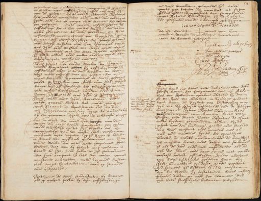 onderlinge met malckanderen aangegaan ende gemaact te hebben eene erffscheydinge ende erffdeilinge over de goederen bij de voors Petronella Wijtman hare moeder naargelaten ende metter dood ontruijm sijnde, ende dat in voegen ende maniere naar besch van volgende, mits welcke erffschrijdinge ende eeffdelinge soo is Jan van der Meulen den onder eerste Comparant te deelen bevallen, een stuck ackerlants groot ontrent vier lopen saden, gele¬ binnen dese voors. vrijheijt ter plaatse genaamt inde schiff tusschen erve Jan Vromans aande eene zijde ende Michiel van Tersel aande ander zijde, streckende met den eenen eynde aan den H: Jast alhier ende metten anderen zijnde aan den gemeijnen wech los ende vrij Waar tegens Jan van der Meulen den Jonge tweede Comparant alleen bij erffscheidinge ende erffdalinge weder is te diele bevallen een woon= huijs mette erffenisse daaraan gelegen, soo ende gelyck het selve jegenwoordich in huer gebruij¬ werdt bij Willem van Aelst cum suis gelegen binnen dese voors. vrijheit te plaatse genaamt inde rechte kerckstraat tusschen erve Jan Dertien Potgaande eene zyde ende dato van Beck aande ander zijde, streckende voor vande gemand straat tot aan de gemeene wech genaamt de Hoochstraat los ende ven uitgenomen een roij dijcx te onderhouden op den gemeenen dyck over de achterste brug Dies soo blijft den voorsz. Jan Hoff van der menen den jonge tweede comparant ten opsien van de beterschap op dit sijn bevallen deel in vergelijckinge van het eerste loth, verbonden aanstonts uijtte reijcken op te leggen ende betalen de somme van vijfftich gulden eens aan Jan van der Meulen den oude eerste Comparant sijnen broedere, daarvan hij bekent oocq voldaan ende betaalt te sijn, Ende sullen de voorss. Condividenten ider sijne aanpart ende loth hier vooren vermelt aanstonts aanveerden mette loopende lasten ende dorps contributien daarop staande ende uijtgaande perthijende de voors condividenten bij namen als op iegelijck portie bij deser erffscheijdinge te dele bevallen, gelovende en ende voorts pet totum in omnibus ut supra Aldus gedaan ende gepasseert ten Comptoire mijns Notaris heden desen 12en Maij 1693 Ter presentie van de ondergess. getuijgen in vander Meulen den onder dit ist handtmerck van Jan van der Meulen den Jongen verclaart niet te konnen schrijven Engels van is als de hoep Jan Peters potters als getijgen uod Attestor Rotterdam Not Publ 6 Inden Name ons heere ende zalichmaacker Jo¬ Christ Amen, soo Compareerde voor mij Abra¬ ham van Rotterdam openbaar Notaris bij den Ed:Mo: Rade van Brabant in s Hage geadmit¬ teert binnen de vryheyt van Oisterwijcq meye zijd van S Bosch residerende ende de getuyge naargenoemt Sijmon Wouter Wagemakers weder weduwenaar van Anneken Aerts van Diesen, ende Maria Pieter Wouters de Laat echteluijden, inwoonderen alhier, beijde gesont naar den lichaam gaande ende staande oocq haar verstant ende memorie over al wel ende machtich sijnde, soo opentlijck blacke, dewelcke overdenckende de broosheyt des menschen levens, ende datter niet seckerder is als de dood ende niet onseckerder als de wed derselver, ende daaromme niet willen van dese werelt affscheijden sonder alvorens van hare tijdelijcke goederen haar bij Godt Almachtich op deser aarde verleent gedisponeert te hebben, Inden eersten dan soo bevelen sy testateuren henne onster¬ felijcke zullen nu ende soo wanneer die uit hare staeffelijcke lichamen scheijden dit Testament is geannulleert door een nader Testa ment in date 28 Mei 1693