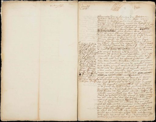 12 mey 1696 1 schelt ƒ van Comparante voor mij Abraham van Rotterdam openbaar Notaris by den Ed:Mo: Rade van Brabant in Sage geadmitteert binnen de Vrijheit van Oosterwycq negerije van Bosch rest derende ende de getuygen naargenoemt Jor. Franche de Grevenbroeck heere in Selvoert, Anthonij Barts en dat van de Ren Wouter Cornelis Brocken endrick van Ba Gerit Anthonis Kemp, Adriaan Pieter Bouwens, Adriaan Gommers van Balfoort Nicolaas Hendrick Theurlinghs, Joost Janssen Timmer man, Jan Lauris Janssen, Geerit van de Pas Adriaan Hanssen van Beneden, Luijcas Frie Pieters, dater Cornelis Reijnenburch, Marten Ansem van Thuijl, Cornelis van Thuijl, Jan Pieters Verhul ende Wouter Paters de Groot, alle inwoor deren ende natueren van Helvoet, woonende ontvan¬ de kerck, de welcke ter requisitie van de regenten ende van Competenten ouderdom ende gemeene nabueren ende ingesetenen van Helvoirt voorss. op hare manne waarheden, een ende vronicheyt in plaatse van solemnelen, add, die sy (des nood ende daar toe versocht synde voor alle heeren hoven rechten ende rechteren daar om presenteren te dan, eendrachtelijck voor de oprechte waar heijt hebben getuijgt, verclaart ende geaffirmeert sulcx doende mits dat seecker stuck wyvelt gelegen alhier aan den Helvoirtsen dyck groot ontrent een morgen van outs genaemt het Huntert pot garron toebehoorende aan de gemeente is een plaatse gansch onbequaam om daar op te bouwen ofte eene wooninge te letten om dat het selve seer leegh ende de gront al te maal moer is waar van het loopensaat jegenwoordich wel waardich is de somme van vyffhondert guldens ende als den mergen drie duysent gl., behalven dat het selve soude strecken tot haer groote ondienst, nadat ende uytterste ongelegentheijt van haar deponenten, alsoo de selve is de eenichste plaatse, alwaar hij deponenten van alle oude tijden hare lege bastjens hebben gesa¬ van ende noch weiden, daarin tegendeel alle het voordat t'gene sij deponenten als nabueren daarvan tot noch toe hebben genoten, t’ eenemaal souden gefrustraet sijn, om dat ontrent de kerck geen gemeente tot haar attestanten gebruyck meer is, verclarende verder by aldien hetselve velt ’t zy in ’t geheel ofte ten deele wierde betimmert, het gansche velt onbequaam soude wesen tot gerieff van haar opponenten ende de verdere ingesetenen, ’tgene sij soo nootsakelyck mitsgaders Gijsbert van Engelen Jan bestiaanse van perick Wouter histiaan Brocken Aert dater Bouwes Paulus Cornelisse, Michiel Heijnen burch, geter Teunisse, Cornelis Arien Solder Pieter Hendrick Hendrick Garite dater Janssen selen Adriaan Arens, Cornelis Janssen van Borg Cornelis Garits Tuijnenburch Jan Symens, Teunis Huybert Theslach ende een Dussen