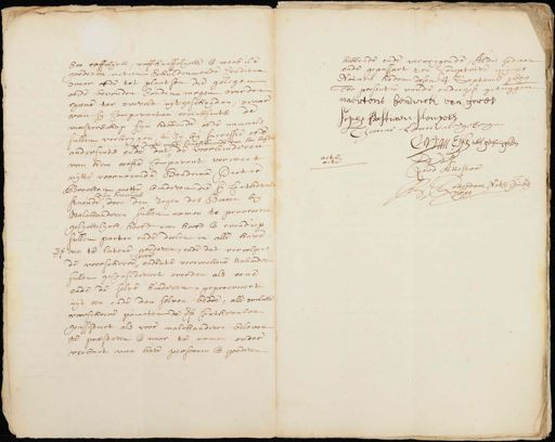 soo erffelijck erffkaaffelijcke ende meubile goederen, actien schulden ende Crediten waar ofte tot plaatsen die gelegen ofte bevonden souden mogen werden tgeene toe wecht uijtgescheyden, waar van hy Comparanten eenichsints de meesterschap sijn hebbende ofte namaals sullen verkrijgen, ’t zij bij successie ofte na doode vande langstlevende van hen beijde andersints ende dat de voorkinderen van hem eerste Comparant verwect uijtte voornoemde Hendrina Pester Brocken mette kinderen die sij Conthorale desen huwelijck staande door den jegen des Hetten by malckanderen sullen comen te procreeren gelyckelyck, hooft voor hooft ende evendien sullen parten ende delen in alle hare voors na te latene goederen, ende dat vervolgens voor de voorscheeve, ende te verwecken nakinderen sullen geconsidereert werden als eene ende de selve kinderen, geprocreeert uijt een ende denselven bedde, alle welcke voorschreve poincten de voors Conthoralen geassisteert als voor malckanderen beloven te presteren ende naar te comen onder verbant van hare persoonen ende goederen at hebbende ende vercrygende, Aldus gedaan ende gepasseert ten Comptoire mijns Notaris heden desen 4 Septemb. 1699 Ter presentie vande ondergesz. getuijgen maertens hendrick van Goret sophi Bastiaen Sleutels Thomas Lurs als gelonge van Een als getuijgen Quod Attestor dam Nots. Publ.