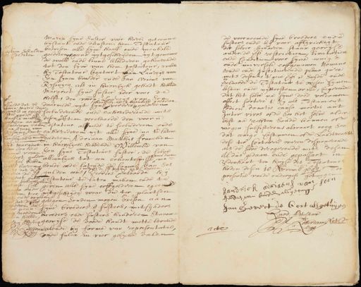 1 smede dat de voorn: Maria dan gen ende in quali tie van de voorss. haaff ende meubile goederen aande kinderen van Jan Ariens van Rijswijcq vermet saakelijcke ende meubeuijt Margriet van son de sommme van hondert gulden sal hebben uitte kooren mits dat de voorss. Maria de Vos hondert gulden onder behoorlicken intrest sal mogen onder houden ter tyt ende wijlen dat deselve inderen de ses penn. van nooden sullen hebben rust dertig Rotterdam Maria syne suster voor hare getrouwt bijstant ende diensten hem Testateur bewesen alle fine hant ende meubile goederen egene uitgescheijden uitgenomen de wolle ende linne kleederen gehoorende tot den lyve van hem testateur, noch hy Testateur legateert van Laurens van son synen broeder ende Jan Arens van Rijplicq als in huwelyck gehadt hebben Margriet syne suster ider voor de helft, den voorn. Lourens van Dorhaaffelijcke ende meubile goederen daarmede uyt syn lederen goederen secluderende ende cheriderende mits desen, Item verclaarde den voorn. Testateur alsmede te secluderen ende exharieeren uit alle zijne na te latene goederen, Adriaan Matthijs Francken huwelyck hebbende ende Willemtie van op syn Testateurs suster, de selve van dien alleenlyck tot een erkentenisse ende ende latende de somme van de mede bij de Maria uijtte keeren gulden een verders verclaarde h Testateur te laten maken ende te geven alle syne erffgoederen egeen uytgescheyde waar die ter plaatsen gelegen souden mogen wesen aan syn broeders ende susters, mitsgaders broeders ende susters kinderen staack gewijs de doode handt wette bevende talende by forme van representatie ende sulcx in vier gelycke doelen actien schulden Crediten de voornoemde syn broeders ende susters ende bij voor aflivicheit der selver kinderen staat gecoise onder de voorss. restrictien, limitatien ende Conditien voor syne eenige ende universele erffgenamen nomine rende ende instituerende plano pre mits deser ’t geven is hande ende verclaarde de Testateur te wesen sijnen lesten ende uijttersten wille, begerende uit het selve na sijne dood volcomen effect sortel t zij als Testament Codicil, donatie causa mortis ant inter vivos ofte soo het selve alderkist na rechten soude konnen ofte mogen subsisteren alwaart oocq soo dat eenige Costumen ofte Landtrechten dese ter contrarie waren disponerende als de selve derogerende mits desen Aldus gedaan ende gepasseert in Eenhout ten huyse des Testateus heden desen 10 Novemb. 1644 ten presentie vande ondergess. getuijgen handrick adriaans van Loon gedaen van buren als getuijge Jan Govert de Cort als getuijgen uod Attestor Rotterdam Nots. 2 G