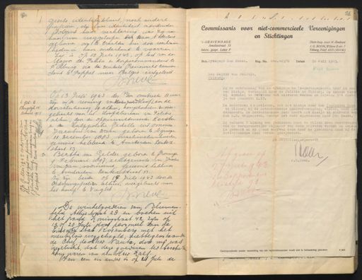 gische identiteitskaart, noch andere papieren, die haar identiteit aanduiden Volgens haar verklaring was zij van haar man weggeloopen en naar Nederland gekomen om te trachten hier door werkzaam - heden in haar onderhoud te voorzien. Zij is op 13 Juli1943, op last van de Majoor der Politie en korpscommandant te Tilburg via den Duitsche Grenswacht Comman - dant te Poppel naar Belgie uitgeleid D Neve Op 13 Juli 1943 des n/m omtreeks 11 uur zijn in de woning van Albertus Jacobus van Hoof < aan de < geb: te Bergeijk 15 maart 1915 aan de Korvelscheweg 19 alhier, aangehouden en over- gebracht naar het Hoofdbureau van Politie alhier, door den opperwachtmeester Kersten en den Hulppolitie Gedelle uit Ommen Jacobus van Dam geboren te Nijmegen 11 December 1883, machinebankwerker gewoond hebbende te Amsterdam Dentext-. straat 53 Bertha van Gelder geboren te Groningen 9 Februari 1897, echtgenoote van Jacobus van Dam, voornoemd, gewoond hebbende te Amsterdam Den textstraat 53. Zij zijn beide op 19 Juli 1943 door de Ordnungspolizei alhier, overgebracht voor het kamp te Vught D. Neve Op 8 Mei 1945 ontvangen van den hoofdagent van politie W Veul 1 gladden ring, monogram ring en 1 dasspeld met twee steentjes M v Loon De winkelgoederen van Blumen- feld Athjestraat 28 en boeken uit het pand Koningstraat 42 zijn op 19 of 20 Juli door personeel van de Einsatzstab Rosenberg met het meubilair weggehaald, niettegenstaande de Chef de Heer Nauta, door mij was ingelicht, dat deze goederen ter beschik¬ king waren van den Heer Kalf. Van een en ander is op 21 Juli de Commissaris voor niet-commercieele Vereenigingen en Stichtingen s-GRAVENHAGE Distr. lnsp. voor N.-Brabant Amaliastraat 13 J. G. BOON, Willem II-str. 7 Interc. gespr. Letter F Tilburg, Telef. 4112 (K4150) Betr. Synagoge Den Bosch. Reg. No. 1240.405/6 Datum 26 Juli 1943. Kapt meens Den Majoor van Politie, Tilburg Bij de ontruiming van de synagoge te 's-Hertogenbosch trof ik aan een kistje, verzegeld door de Politie te Tilburg. De inhoud bleek bij opening te be-staan uit zilveren vorken en lepels. Het kist - je was gemerkt: K. 19. Na onderzoek is gebleken, dat dit kistje door den Joodschen Raad te Tilburg bij de Rotterdamsche Bankvereeniging, alhier, werd ge¬ deponeerd. De Rotterdamsche Bank heeft dit kistje in opdracht van den S.D. vrijgegeven, waarna het werd opgezonden naar Den Bosch. Ik verzoek U alsnog den Joodschen Raad te willen doen ondervragen wie de oorspronkelijke eigenaar van deze zilveren vorken en lepels is geweest en op grond waarvan deze door de joodschen Raad bij de Rotterdamsche Bank werden gedeponeerd. De Districtsinspecteur Boon J.G.Boon. K 2319 Correspondentie zonder vermelding van ons registratienummer wordt niet in behandeling genomer Afgedaan op 27 Juli 1943 Zie Rapportenboek bladijde 91 D Neve