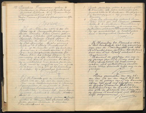 3. Caroline Fransman geboren te Rotterdam 10 Maart 1919, zonder beroep, gewoond hebbende te 's - Gravenhage Stuivenzandstraat 196. Caroline Fransman is op 27 October 1943 op transport gesteld naar ’s Gra - venhage D: neve Op 11 - November 1943 is door de Groot van de Ommensche politie aange - houden Cornelia Klein Jodin, geboren te Tilburg 4 October 1905, echtgenoote van Henricus Johannes Balk, geboren te Haarlem 16 April 1901, ketelmaker der Ned: Spoorwegen, Arisch, gewoond hebbende te Tilburg Piusstraat 8. Zij is op 12 November 1943 ter beschikking gesteld van de Sicherheitspolizei te 's-Her - togenbosch. Overgebracht door Wachtmeester Spee Cornelia Klein had indertijd opgegeven bij de aanmelding op de Afd: Bevolking, dat zij maar Twee Joodsche Grootouders had, terwijl zij in werkelijkheid vier Joodsche grootouders heeft, zoodat zij verplicht was om de Joden ster te dragen en een " J " op het persoonsbewijs te hebben. Zij is gemengd gehuwd. D Neve Op 16 November 1943 des middags om - streeks 13.20 uur, zijn door den rechercheur Vas van de Sicherheitzpolizei te 's - Gravenhage Nieuweparklaan 16, aangehouden de Joden 1. Benjamin Sonnenberg, geboren te Lencus (Polen) 1 Maart 1891, Jood, koopman gewoond hebbende te Heerlen Hamers straat 51. 2. Sijma Sonnenberg geboren Greuspan geboren te Wcernier (Polen) 13 Maart 1889, Jodin, gewoond hebbende te Heerlen Hamersstraat 51 3. Gisela Sonnenberg, geboren te Duisburg 10 November 1919, jodin, ziekenverpleegster gewoond hebbende te Amsterdam Weesperplein 1 Zij had eerst opgegeven te zijn genoemd Agnes Cremers. 4. Leiser Leo Sonnenberg geboren te Lencus¬ (Polen) 8 Juli 1894, Jood, koopman, gewoond hebbende te Amsterdam Franschelaan 27. Zij zijn aangehouden in de woning van Jan Frans Moonen geb: te Arendonck 26-9-'86 wonende Bredascheweg 101 Tilburg. Zij zijn onmiddellijk op transport gesteld naar 's-Hertogenbosch Wolvenhoek 7. D. Neve Op Woensdag 24 November 1943 is het houtwerk, dat nog aanwezig was van de Bandagefabriek van Hollander aan de Jan Aartestraat door den Heer Kalf verkocht en opgeruimd. Eveneens de goederen die nog in de garage van Ph. Roeg aan de Telegraafstraat 29 aanwezig waren, met uitzondering van de auto. Deze bevindt zich nog in de garage Remmen Drie gewichten een van 25- een van 10 en een van 5. K.G. die nog in de garage van Roeg aanwezig waren, zijn door mij afgegeven aan de firma Groza, in Sanitaire artikelen aan de Markt alhier die ook de bascule van Roeg, van de firma Hamburger uit Utrecht heeft overgenomen. Remmen