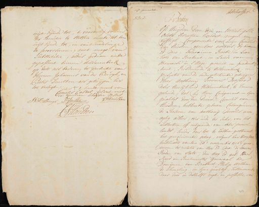 uijt eijnde toe ’t voordeelig vonnis ter Executie te stellen meede tot den uijt eijnde toe, en vant nadeelinge te provoseeren met magt van substitutie, Aldus gedaan ende gepasseert binnen Hilvarenbeek op dato als boven, ter presentie van d’heeren Johannus van der Burgh en Pieter Smelten als getuijgen hier toe versogt, dit is ’t handt merck van Cornelis Casteel klaert met konnen schrijven Testis Heusden Burgh willen Heusden uijt gemaekt No 2 Althoffer D: Vanden Op huijden den drie en twintigste October seventien hondert negen en vijfftigh, Compareerde voor mij Cornelis van Heusden openbaer notaris bij den Ed:Mo: sodaramen Raede en leen hove van Brabant, en lande van vermaeke in ’s Hage gecreert en geadmit teert, Residerende te Hilvarenbeeck, in presentie van de ondergeteekende getuijgen dheer Anthonij Timmers Drossard deser heerlijkheid hilvarenbeeck, te kennen gevende, dat hij heere Comparant in sijnen qualitijt door den deurw=r Cornelis van Heusden, hebbende gedaan calangieren de persoon van Anthonij Meelis, woon¬ agtig alhier over ende ter sake, van het insteeken off ontgronde van seker perceel landts, sonder daer toe te hebben geobtineert het gerequireerde octroij, volgens haer Hoog Mo= publicatie van den 30e november 1716, geno= men te relatie van haer Ed: Mo: de Heeren Raden van State; den Hoog Ed: ged: Heer Raed en Rentmeester Generaal de Domijnen van Brabant Philip Willem de schieling, in sijne qualitijt, sustineerende daar door in desselfs regt en possessie van