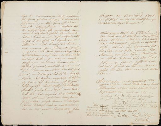 beijde te nomineeren, en te institueeren tot sijnen off hare Eenige en universeele Erffgenaam, in alle sijnen off haare naar te laetene goederen nietwes daer van uijtgeschijde ofte gereserveert, dan alleen de Legitime portie henne naerte laetene kinderen na regte competerende verders is den wille en begeerte vande Testateuren dat henne vier kinderen met naame Jan Pietronella, gestrum en Gerrit, na doode van den langstlevende de testateuren, uijt haare nalatenschap voor uijt sullen gemeten en moete ontfangen ider eene somme van Vijfftig guldens, makende te samen eene somme van twee hondert gul= dens, en ’t overige dat bij den langst levende sal worden nagelaete te zeijlen bij haare vijff kinderen off bij voor aflijvigheijt haare wettige desendenten staakt geweijsen, dogh met dese restricte, dat ingeval haar testateur dogter Johanna getrouwt met Jan pijnenborg mogte komen te overleijden sonder wettige kinderen naar te laeten dat in dien gevalle haare portie sal ƒ overgaan aan haare voors: broers en susters en bij vooroverlijden op derselver wettige decendenten allen tgeene voors: de Testateuren van woorden tot woorden voorgeleesen sijnde, verklaeren, deselve, dit te weesen haar testament, laeste en uijtterste Wille, willende ende begeerende dat het selve naar doode van den Erff stervende van haar beijde standt grijpen en Effect sorteren sal, het sij als testament, Codicil, gifte ter zaake des doots off onder den levende, soo ende gelijck het selve best naar regte bestaen kan Aldus gedaan, ende gepasseert ten woonen huijsen vande Testateuren binnen Hilarenbeeck op dato als in ’t hooft deses ter presentie van Wouter van Esch en Anthonij ende hagen als getuijgen van goede gelooven hier toe versogt dit ist hantwerck van adriaen Wilbors verclaert mits sum indispositie dit is het niet anders te konnen schrijven, teken hantmerck van antw=de ondergeteekende het petestaat claert wouter van esch niet te konnen schrijven Testis d:o ondergeteekende Antonij Hend:k Hagen een