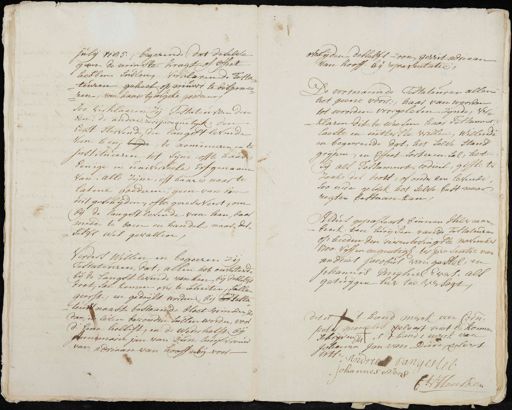 Julij 1785 begerende dat deselve geen de minste kragt of effect hebben sullen verklaren de Testa¬ teuren geheel op mus te disponden ren van haar tijdelijcke goederen soo verklaaren zij Testateuren den Een de andere reciprocquelijck den Eerst stervende den langstlevende van hen beijde, te nomineeren en te Institueeren tot sijne offte haar eenige en universeele Erfgenaam van alle zijne off haare naar te latene goederen, geen van dien int geschijden, ofte gereserveert om bij de langstlevende van hen daar meede te doen en handel, naar de selfs wel gevallen Verders willen en begeeren zij Testateuren, dat, allen het onverteerd, bij de langstlevende van hen bij desselfs doot, sal komen over te schieten, sullen geerft, en gedeijlt worden bij testa ten naast bestaande bloet vonden de dan in leven bevonden sullen worden, voor d’ eene helft, en de wederhelft bij denemare Jan van Dun huijsvrouw van adriaan van hooff en bij voor overlijden, desselfs zoon Gerrit Adriaan van hooff bij representatie De voornoemde Testateuren allen het geene voors haar van woorden tot woorden voorgelesen zijnde, ver¬ klaren dit te weesen haar Testament laeste en uitterste willen, willende en begeerende dat het selve stand grijpen en Effect sorteren sal, het sij als Testament, codicil, gifte ter zaake des doots, of onder den levende soo ende geluk het selve best naar regten bestaan kan, Aldus gepasseert binnen silvaren beek ten huysen vande Testateuren op heeden den vierentwingste name 1700. vijff en negentigh ter presentie van Andries Jacobus van gestel, en Johannis Mighiel Evers, als getuygen hier toe versogt dit hand merck van Corn: het marcelis verclaart niet te konnen schrijven is ’t handt merck van Johanna Jan van Den geleyt int Andrie van gestel Johannes een Heusden