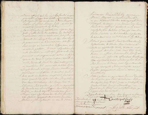 zamen of elk van hen in't bij sonder mogte gemaakt of gepasseert hebben, niet willende ofte begerende dat eenige van deselve kragt hebben of effect sorteren sullen, maar op nieuws disponerende bij desen soo verklaarden sij testateuren uijt een conse¬ gale Liefde die sij den anderen sijn toedragende malkanderen over en weder over dat is den eer¬ stervende den Langstlevende van haar beijde te nomineeren en te institueeren tot sijn of haar eenige en universele Erfgenaam ende in alle de goederen, soo vaste erfgoederen, hoe ende meubilen en inboedel, gout ende heer gemunt ende ongemunt, actien en Credit egeene ter wereld uijtgesondert, welke de eerststervende met ter dood ontruijmen en naarlaten sal omme alle deselve bij den Langstlevende als vrij Heer en meester ge„ possideert en beseten te werden, onder dese mits en Conditien nogtans, dat alle Wat naar t overlijden van den Langstleven¬ van haar testateuren sal komen over te schieten, sal worden geërft en geprofite bij Cornelia van Sint Cruijen, haar testatrice nigte, en dat de voors Cornelia van Sint Pruijen uijt sal keeren aan de drie kinderen van Gerrit Egmonts, met name Cornelia, Maria, en Jan Egmonts, en aan de drie kinderen van Eduart Balij met name Maria, Magriet en Jacobus Bonklij¬ en aan Nicolaas Fransen woonagtigh tot Tilborgh, tezamen eene zomme van een hondert en vijftigh guldens, en bij voor overlijden van deselve of eenige van dien haare kinderen in des overledens plaatse, deselve daar inne institueerende bij desen Allent geene voorsz: staat verklaarden sij testateuren te weesen haar testament Laaste en uijtterste Wille, willende ende begevende dat het selve daar voor zale„ deesen en effect sorteren sal, het sij als testament, Codicille of andere makinge Van uijtterste wille soodanig het best sal konnen bestaan, niet tegenstaande eenige vereijste solemniteijten naar Regten gerequireert hierinne vaare ge¬ omitteert Aldus gedaan en gepasseert binnen den Loon ten huijsen van haar testateuren heden den Agsten Julij xvij zeven en Veertigh, ter presentie van Cornelis Haansberge en Gerrit van de Graaf als geloofwaardige ge„ tuijgen hier toe versogt Dit is het hand merk van Arien Egmont, verklaart met anders vermits sijn siekte te konnen hoij en Dit is het handmerk van Cornels Hans Bergh 1748 Francijntje Cooman verklaart niet te konnen schrijven groot van de van Wille Nots: pub: