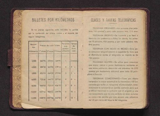BILLETES POR KILOMETROS En los precios sigulentes están incluidos los gastos por la confección del Billete, timbre y el importe del¬ seguro obligatorio. Recorri- dos Kilómetros Precios de cada billete Personas que pueden utilizarlo Tiempo de dura- ción 1.o clase 2.o clase 3.o clase 3,000 4,000 5,000 6,000 8,000 10,000 12,000 363'90 484'30 605'05 725'50 966'85 1207'65 1448'90 273'45 36'90 454'20 544'70 725'50 906'55 1087'45 164'90 219'15 273'45 327'65 436'10 544'70 653'25 1 2 3 4 5 6 7 3 meses 4 > 5 > 6 > 8 > 10 > 12 > Recorn- Precios de codo billete Peronos lonoo poeden Kilometros 1close 2.'close 3clase utilizoro 36390 27345 3 meses 43120 36390 21915 61505 48420 | 27345 72550 54470 32765 96685 725•50 43610 1069 120765 90655 54470 12.000 148 90 I08745 48375 CLASES Y TARIFAS TELEGRÁFICAS TELEGRAMA ORDINARIO Las primeras diez pala¬ bras, l'65 pesetas y para cada palabra más. 0'15 ptas. TELEGRAMA URGENTE.—Se transmite y se lleva a domicilio con preferencia a todos los demás, las prime¬ ras 10 palabres, 4’65 pesetas, y por cada palabra más, 0’45 pesetas. TELEGRAMA CON ACUSE DE RECIBO.—Sirve pa¬ ra comunicar telegraficamente al expedidor la hora que el dèstinatario recibe el telegrama, su importe es de 1’65 pesetas. TELEGRAMA MULTIPLE—Se utiliza para comunicar uno misma noticia a varios destinatarios residentes en una misma población, abonando una sobretasa de 0’50 pesetas por destinatario adicional para cada 50 pala¬ bras o fracción. TELEGRAMA COLACIONADO.—Tiene por objeto comprobar la mayor exactitud en la transmisión.—El fun¬ cionario que recibe un telegrama «Colacionado», inme¬ diatamente lo retransmite en sentido contrario para que el Oficial transmisor lo confronte con el original, y una vez comprobado que ha sido recibido sin error, autoriza su curso.—Se percibe por este servicio una sobretasa del 50 por ciento del importe del telegrama.