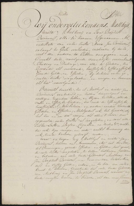 Heller als Wij ondergeteekendens, Matthijs, Wouter Anthonij en Jan Baptist Brouwers, alle te zaamen Erfgenaamen Al¬ intestato van onze zuster Maria Jan Brouwers onlangs te goule overleeden, verclaaren bij deese met den anderen te hebben aangegaan ende gemaakt deeze navolgende vriendelijke overeenkomst scheiding en deilinge, van alle de goederen, zoo Roerende als onroerende haeffelijke Erffhaeffelijke Gereede Gelde, en Effecten, bij dezelve onze ge= melde suster nagelaaten, in voegen en maniere als hier navolgende Overmits dewelke, zoo is Matthijs en Wouter Jan Brouwers aanbedeeld, en zullen dienvolgens in wettigen eigendom hebben en blijven bezitten, alle de vaste en Erffelijke goederen, zoo mede de taaffelijke haaffelijke Meubilaire en andere verdere roerende goederen en Effecten, mitsgaders ook het gereede, al= les zoo en in dier voegen als allen ’tzelve door opgemelde onze zuster is nagelaten; en met alle zulke lasten pagten, chijnsen en renten &:a, welke die ook zijn mogen en onder welks benaming die ook zoude konnen gebragt worden, waar en teegen wij Matthijs en wouter Jan Brouwers, beloven en aanneemen ider uit de boe¬ del penningen, gereede Effecten en Gelden, door gemel= de onze zuster nagelaten, te zullen uitkeeren, voldoen en betaelen aan onze beide gebroeders Anthonij en Jan Baptist Brouwers, eene somme van zeeken on¬ dest en vijftig gulden, indien en zo dra een onzer komt te trouwen, genietende dus onze beide gebroede, ren Anthonij en Jan Baptist Brouwers, wanneer wij beide mogten komen te huuwen, als dan eene somme van