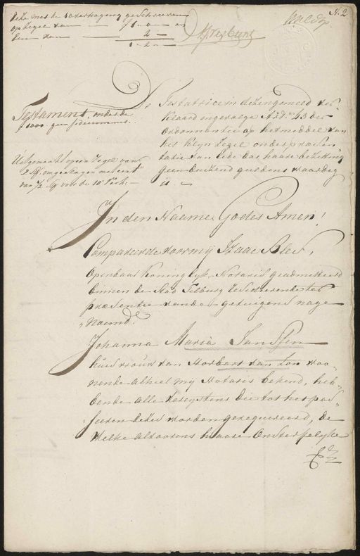 deze met de overhoging geschreeven ƒ 10„en op zegel van 2: Een van 1„2„ Testament onderde ƒ 1000 geen gedeicommis Uitgemaakt op een zegel van 2 s omgeslagen met eert van ½ sij voor de 10 Verh: No. 2 Heer ben De Testatricen dezen gemeld ver¬ klaard ingevolge Art: 13 der Ordonnantie op het middel van „ het klyn zegel onderpresen¬ tatie van Eede dat haare bezitting geen duizend guldens waardig 11 In den Naame Godes Amen aan Bles, Compareerde voor mij Openbaar Koninglyk Notaris geadmitteerd binnen de Stad Tilburg resideerende ter presentie vande getuigen nage¬ noemd ten Maria Jans Johanna de de huisvrouw van Horbart van son woo¬ nende alhier mij Notaris bekend, heb¬ bende alle vereystens die tot het pan „seeren dezes worden gerequireerd, de Welke alvoorens haare onsterftelyke