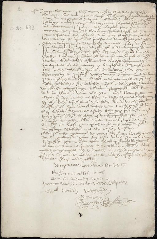 9 1679 compareerde voor mij Cornelis van Vossel, Openbaer nots. bij den Edel Mogende ende van Brabant in sGravenant geadmitteert binnen de vrijheijt Oosterhout residerende ende de gelooff getuijgen overgenoempt Dingeman Lambrechts de Bie out ontrent 34 jaeren, ende huijs Cornelis Cool ont¬ ontrent 26 jaeren dewelcke gesaementlick ende ider in ’t besonder ten versoecke van Cornelis Anth Stadthouders woonende op stuijvesande jurisdictie van Oosthout voorss. hebben getuijght verclaert ende gedeponeert sulcx deselve is doende bij desen, deughdelick ende waerachticht sijn, dat sij deponenten inden begingen voorden voorleden oorloge tusschen den coninck van Vranckrijck ende de staet, ten tijden alswanneer eene regiment ende spaenjaerts waeren gecomen op stuijvesande ende de made hebben gesien dat ende gehoort, dat eenige derselve gicenten de huijsinge van den voorn. Requirant teeneman hebben uijtgeplundert, ende alles medegecomen wat sij los ben gevonden, soo meublen imboel, drie vette verckens ende mede gecomen de kasse overgeslagen, ende daeruijt gehaelt, alles wat daerin was, voor redenen van wel wetenheijt allegeren sij deponenten te eeten den eerste deporent dat hy ten selven tijd was den arbeijder vanden voorss. Reqt. ende alsdoen in sijn werck ontrent de voorss. huijsinge was ende sy tweede deponente alsdoen ende noch is, dienstmaecht „ voorss. vorden voorn. reqt ende oversulcx vant gepasseerde seer goede kennisse te hebben, allen tgene voorss. is verclaeren sy Compt te wesen henne verclaeringe presenteren deselve des versocht werdende acht eede te sullen verifieren Ende is mede gecompt den voors. reqte dewelcken verclaert dat de goederen die hem ten tijde voors. sijn ontvreucht bij gissinge op ’t nichte wel weirdich sijn geweest de somme van eenhondert vierentwintich gulde, Aldus gedaen ende gepasseert den 17 decembris 1679 ter presentie van Pr: van den Eque ende Aert Dillissen verheijden als getuijgen hier toe versocht ende geleden dingeman Lambrecht de bij een cornelis Cornelis Anthonissen athouder Pieter Wielemeeusen vanden Lijnden ker dielisen verheijde My Toirconde slock Nots: publ: 1679