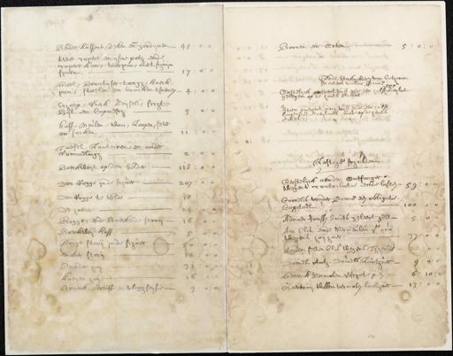 Bedde kussens, deken en gordijnen ƒ 45:0:0 twee copere en ijsere poth ende copere kan, vierpan met schuijm 17:0:0 gaf 10 heel, brantijser, tang, hoeck van stoelen en bancken tsaemen Scheep. Rieck reijsels, sicht, 3:0:0 Bijl de capmest kaff Meulen, want, loopen, seven 11: 0:0 die sacken Taefel, Lanteren, en ander 2:0:0 Rommelingh boeckweijt op de solder 118:0: 207:0:0 Den rogge in de schuer Den rogge te velde 24: de haever Rogge ende boeckende stroij 16 Boecken kas Rogge stroij in de schaer haer stro beiden hen 16 koeijen hoij braeck. werff en vlagh seijsie 3: 5:0:0 Boogen en Erven ende steckroederen van Catharina Martens vander Panne hoop Eerstelyck omtrent vijff ende een halff laeijlant gelegen op de houts bickers Item omtrent noch vijff ende een halff loopensaet zaeijlants mede op de cents Ackers lastige schulden Eerstelijck aen den ontfanger wegens contributie ende lasten 59:0:0 Cornelis vander Banne een obligatie 100:0:0 Capitael Adriaen Janssen smits geleent gelt 5:0:0 Aen Clis ende Vermeulen ge qua37:0:0 wegens hoij haer Aende selven lis wegens thiende 22:0:0 Daniel Anth. Daniels Lanther 9:0:0 6:10:0 Banck vermolen verschote pen Geertruij Willem vermolen langer 1300 24