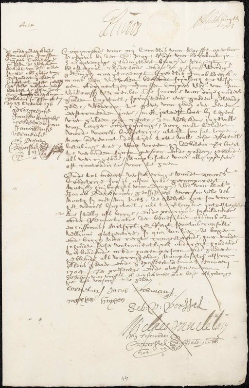 With buyten Acte 18 de Compareerde voor mij Cornelis van Vorssel openbaer Notaris bij den Edel Moge Rade van Brabant in s Gravenhage geadmitteert binnen de vriheit Oosterhout residerende ende de gehoort weirdig getuijgen naergenoempt Cornelis Jacob Berck, mans denwelcken bekendt schuldich te wesen aen Adraentjen Janssen Cuijpers wede. van Jan Willemssen vermeulen de somme van driehondert gulden capitael, spruitende over goeden geleende gelde, wederom te geven van heden over eenen eerstcomenden jaere, met intrest daer bij tegens int gulden percento, denwelcken ingevalle van langer offde houdinge, doch niet believen vande voors. creditrice, altijt soo sal loopen naer advenant des tijts totte volle ende effectuel betalinge toe, waer voren hij debiteur verclaert te verbinden sijnen persoon ende goederen, hebbende als vercrijgende, namptisatie voor alle opposite oft contradictie, voor te gaen Ende tot medere versekeringe van de voorss. creditrice soo is alsnu mede gecompareert Maeijken huijbrechts van Dongen, wede. van Zalr. Jacob Beeckmans, geassisteert voor soo vele des nooth sij met mij nots., dewelcke haer soo voor het voorss. Capitael, als te verloopene intresten verclaert de te stellen als borge, ende principale schuldenaer onder Renuntiatie der benefitien ordinis et excussionis, mitsgers. het Recht senatus consulti velliani authentice, si qua mulier, de borgen ende borgen naer rechte competerende, haer vanden inhouden deser volcomentlijck onderricht houdende verbindende mede haeren persoon ende goederen hebbende als vercrygende, namptisatie als voor Aldus gedaen ende gepasseert den 24 Januari 170 Ter presentie ende overstaen van Sebastiaen van Vossel ende Niclaes van de daer beide als getuijgen hier toe versocht ende geleden Cornelius Jacob Heckmans Maeijken huysen lb: borstel elkes van dela mij Toirconde tersse Nots. Publ 1704. 44 de order geteeckende Adriaentjen Janssen Cuijpers Creditrice in desen de welcke hout van dese geven staende obligatie van driehondert guldens Capitael mette int de selve voldaen ende betaelt te wesen door Corn Janssen Beeckman detentie desent den 23 October 1711 adriaensz Jansen Kuijper weede vrou van Jan willemsz vermeulen mij present vors. 171