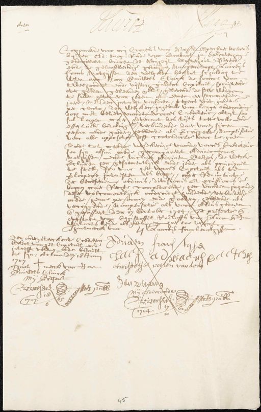 Acte sch buyten D ƒ Compareerde voor my Cornelis van Vorssel Openbaer Notaris bij den Ede: Mog: Rade van Brabant in s Gravenhage geadmitteert binnen de Vrijheijt Oosterhout residerende ende de geloofweirdige getuijgen naergenoemt Laureijs rans Mathijssen denwelcken bekent schuldicht wesen aen Jan Pauwels Clinck de somme van tweehondert ende vijftich guldens capitael, spruijtende over goeden geleenden gelde, gelovende deselve wederom te sullen geven van heden geenen eerstcomenden jaere, met den intrest vandien, tegens vier guldens per cento, dewelcken ingevalle van langer onderhoudinge doch met believen vande voors. crediteur, altijt soo sal loopen naer advenant des tijts totte volle ende effectuele betalinge, verbindende daer voren sijnen persoon ende goederen hebbende als vercrijgende, namptisatie voor alle oppositie oft contradictie voor te gaen rade tot meerdere versekeringe vande voors crediteur soo sijn alsnu mede gecompareert Adriaen Frans Mathijssen, ende Niclaes Adriaen Pieters, dewelcke verclaeren het gesaementlick ende ieder als principael te stellen soo voor het voorss. capitael als te verloopene intresten als borgen, onder Renuntiatie der benefitien ordinis, divisionis et excussionis de borgen naer rechte competerende, het vanden houden dese volcomentlijck onderricht houdende, verbindende mede heure persoonen ende goederen, hebbende als vercrijgende, namptisatie als voor Aldus gedaen ende gepasseert den 17 October 1704, ter presentie ende overstaen van Christoffel Roeloffs van Loon ende Jan Rynants beyde als getuijgen hier toe versocht hantmerck van anijs Frans mathyssen Adriaen Frans tijsen Claes Adriaens aen Christoffel roelen van loot na my toirconde Nots. publ voorss 1704.62 43 Een overgetekende crediteur bekent van het Capitael ende intrest voldaen ende betaelt syn, Actum den 18 Juni 1707 frant tmerck van Jan Pauwels linck Me present ossen als 1707