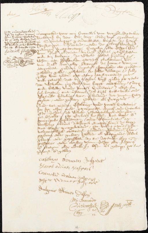 319 ƒ Act 1 Compareerde voor mij Cornelis van vors. Notaris bij de Ede: Mog. de van Bram nu pouverhun gedecreteert binnen der Oosterhout residerende, ende de slooffweirdat getuijgen naergedacht Cathalin, Adressers wed van sal Adriaen Niclaes Pieters geasisteert goot mij notario, dewelcke bekent schuldich sen aen Willemken Henrick Ackermans de van sal. achter struijck de somme van eenhondert guldens capital, spruitende over goeden geleerden gelde, gelovende de selve wederom te sullen geven van heden over den eerstcomenden jaere met intrest daerbij tegens vyff gulden per cento denwelcken ingeval van hagger onderhoudinge dog met believen vande voors. creditrice, altijt soo sal loopen, over advenant des tijts totte volle ende ectuele betaling toe, verbindende daer voren hare persoon, ende goederen eende als vercrijgende Ende tot meerdere versekeringe vande voorss. Creditrice soo sijn alsnu mede gecompareert Jacob ende Cornelis off de geseert, de welcke gesaementlick ende ieder int behouder hem verclaren te sullen tot vooge principale schuldenaer, (onder Renuntiatie der verefitien ordinis divisionis et excussions de vooge naer rechte competeerd, het vanden inhouden deser en vercomentlick overicht honderde, vindende „ een persoonen ende goederen hebbende als krygende, Aldus gedaen ende gepasseert den 28 December 1697 ses presentie ende overstaen van Resper de festers Anthon de Dillissen bijde als getuygen hiertoe socht ende gebeden atenis Adriaen Peper Jacob adriaen Jasper nelis adriaen appel esper Adriae gespe mens voren aen Toirconde veel 1697. 28 12 12 Een ondergeteekende uijt den naeme van sijne moeder breder ge in desen bekent dat het Capitael ende intrest is voldaen ende beten den 14 November 1700 Hendrick Struij 1 Me present vors. Nots. 1700588