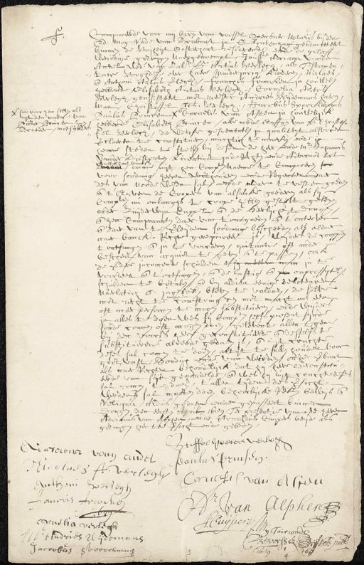 compareerde voor mij Cornelis van Vossel openbaer Notaris bij den ƒ Ed: Mog: Rade van Brabant in ’s Gravenhage geadmitteert binnen de Vrijheijt Oosterhout residerende, ende de gelooft weirdige getuijgen naergenoempt Jouffr. Adriana vander Andel wede. van Zale. Sr. Artus Verlegh, als Testamen¬ taire Vooghdesse over haere minderjarige kinderen, Niclaes ende Antoni Artus verlegh, Francis Forcken in houwel. hebbende Elisabeth Antis verlegh, Cornelia Anto verlegh geassisteert met meester Andries Weijdemans haer man Christoffel is verlegh, Jacobus Spoockmans Paulus Princen Cornelis van Asten in houwelyck hebbende Elisabeth Princen, alle mede Erffgen. van Schoute kel verlegh, dewelcke gesaementl. qualiteijt alsvoren verclaeren te constitueren, krachtich te maecken ende hem steden te stellen bij desen de heer ende Mr. Johannis van der Biestraten Licentiaet in de achten ende Advocaet tot Oosterhout voorss. , omme uijt hen Compen naeme te compareren toe voor soodanige heeren wethouderen ende Regenten daer des van noode wesen sal ende aldaer te vesten goeden ende 't Erven de Coopers van alsulcke goederen als sij Compten nu onlanghs te coope hebben gestelt gelegen onder Zuijder wijn cappel, ende de heerlijcheijt doogh ende hen Comparant daer van t' ontgoeden en t'ontersen ende daervan te verleijden soodanige bescheeden als aldaer naer banck rechte gerequireert is, wijders de cooppen t ontfangen ende in te voorderen, quitantie oft ander bescheit van quiet te geven ende te passeren, oock de verdere incomende schulden tsy mette in ’t voorden ende t'ontfangen, ende de lastige ende oproffiter schulden te betalen ende by aldien eenige debiteuren naerlatich ende ingebreken bleven te voldoen, deselve in met recht te constringeren met macht out een oft heer persoonen te mogen substitueren, ende wijders in alles te doen wes sij Comptn. selfs present synde soude coomen oft actie over geleverde allentgene by den voors. heere geconstitueerde ende desselfs substitueren alverde gedaen is, ende uyt cracht deses sal comen te doen, altijt te sullen houden voor goet, vast, bondich ende van werden,, onder verbant als naer rechten behoudelijck dat hij heere geconstitu¬ eerde van sijn gehandelde, ende wes hij uijt crachte dese sal comen te doen, tallen tijden des versocht werden sal moeten doen behoorlijcke resten bewijs ende reliqua, Aldus gedaen ende gepasseert bingen doogen den eersten April 1689 ter presentie van de heeren Adrianus van Alphen ende Arnoldus Compers beijde als getuygen hiertoe versocht ende gebeden Stoffel Geeter verle¬ Paulus prinsen Cornelis van Assen van Alphen Cuijpers Mij Toircond ossen 1639 Dicteren van ander Nicolaes verlegh Anthoni verleg Fancois Franke Cornelia verlegh Andries Wijdemans Jacobus voorckman soo voor hemselven als uyt den caense van Pieter Princen syne Booter, mitsgaders