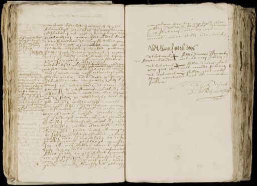 van henne tijdelijke goederen bij Godt Almachtigh verleent so hebben de voors. Testateuren in ’t wijse en voorsienige des maelcanderen over, ende weder tewel eerstervende de langste boende gemae¬ heer ende m voorval van alle ende gelijcke de haeff en meubele goederen erffgoeden gelt gout silver gemunt en ongen actie schult ende crediten egeene gereserveert off wtgesondert Testatrice midts bij de Langstlevende aende van het verledene voorn. testate naeste vrinderen wtgereijckt worden eene somme van vijffentwintigh gulden sonder meer ende daeren hoven betalende alle de schulden alle t voors. is verclaerde de voorn. te wesen te stament laetste ende wtterste wille, willende ende begeven dat denselven in alle poincten ende lede¬ sal worden achtervolght, cracht, en acht hebben hij bij forme van Testament, Codicil, donatie in te veel causa mortis, leg¬ soodanigh contract, als imandt isten aensche laetsten, ende sterste wille alderbest ende bondigste soude comen off mogen bestaen, niettegenstaende eenige missie in de formalitijt te deser gerequireert gepleegt mochte sijn, oft oock datter eenige costen dese eenigsints waer contrarieren Aldus gedaen en gepasseert te woont der staturen, ter presentie van Aert Jansse vande Pol ende gerdt Marten Janssen als getrij¬ ende off het saken waere dat de voorn. Willem voor sijne ijser ouwe quaeme te sterven soo sullen sijne Erffgenamen mette voorn vijffentwintigh gulden affstant moet dehondert iets meer te nogh pretender en dat om reden hen daertoe mo tleven van henne beijden soo lange imand van henne beijde int les sal wesen van geloove hiertoe versocht ende geleden, die dese beneffens de voorn. stateur ende mij notario voornt. mede hebben ondertekent, Warmelders dit kant merck stelde dvoorn. Adriaens de dieverclaerde niet te omschre dit hant merck stelde dvoorn. Aert van goet als niet comende schrijven dit kant merck stelde gerrit marte Jansen verclaerde niet te schrijven, Mij Present D: De Roy nots. 43