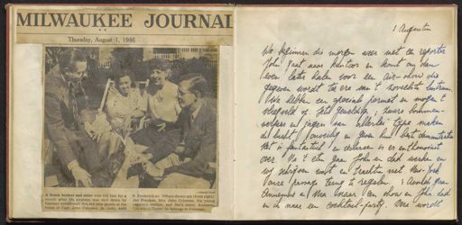Regionaal Archief Tilburg, archieftoegang 528, Plaatsingslijst van de collectie memoires en dagboeken Tweede Wereldoorlog, Tilburg, 1940 - 1945, inventarisnummer 27, DAGBOEKEN, Dagboek Jan Franken, 20 juli-27 augustus 1946. Hij reisde samen met zijn zus Annemarie door de Verenigde Staten, op uitnodiging van Amerikaanse piloten die zij in 1944 hebben geholpen met onderduiken in Tilburg en transport naar velig gebied, inclusief foto's, 1946