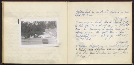 Regionaal Archief Tilburg, archieftoegang 528, Plaatsingslijst van de collectie memoires en dagboeken Tweede Wereldoorlog, Tilburg, 1940 - 1945, inventarisnummer 27, DAGBOEKEN, Dagboek Jan Franken, 20 juli-27 augustus 1946. Hij reisde samen met zijn zus Annemarie door de Verenigde Staten, op uitnodiging van Amerikaanse piloten die zij in 1944 hebben geholpen met onderduiken in Tilburg en transport naar velig gebied, inclusief foto's, 1946