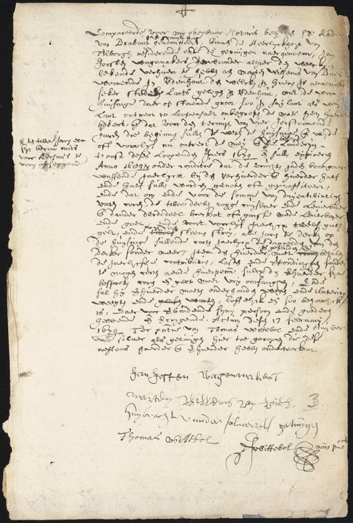 # ten twee jaren daer syn veroir mits voor Rechmis te voren opseggende ¶ Compareerde voor my obenbaer Notaris beijde den Edele Raden ons graven haer van Brabant geadmitteert, binnen de heerlijckheyt van Tilborgh residerende ende de geruijgen naergenoem, Jan Joosten wagemakers gewoonder alhier den welck lekende vechuen te hebben aen marten Willems van Buel woonende in Udenhout, den welcken in hueren is aennemende seker steden lants gelegen in Udenhoir, met de woon¬ huijsinge daer op staende groot soo in saylant als weij¬ lant ontrent 10 loopensaet onbegrepen de mate hem hierde bekent, ende dat voor den termijn van vier Ierstcomende taren die beginnen sullen te weten de huijsinge ende wyde belast oft voorlyf nu ontrent de mey ende de, landeryen t’oost deses loopenden jaers 1679 en sullen expireren Anno 1683 ende onder conditie dat de vruchten in den boomgaer wassende jaerlycx bij den verhuerder ende huerder half ende half sullen worden genoten oft geproffiteert. ende dat om ende voor de somme van dryentwintich vaten coren, de twee deelen rogge cuijsbaer ende leverbaer ende d'ander derdedeel boeckent oft garste mede leverbaer ende goet, ende voort voorlijf jaerlycx twelf gul. gelt, ende twelf steenen stroy, alle jaren te decken op de huysinge sullende costen jaerlycx de daggelden van den is gehouden en decker sonder meer, item den huerder, moet comen betalen de jaerlycsche contributiën, lasten ende verpondinghen sonder te mogen corten aen de huerpenn. sulcx den verhuerder sijne besproken coren ende gelt moet vry omfanghen. Ende sal hy verhuerder moeten onderhouden wegen ende watering weegten ende glasen wanten, loffelijck ende soo behoorlycken is, daervoor verbindende sijnen persoon ende goederen hebbende ende vercrygende. Actum desen 13 februam, 1679 ter presentie van Tomas Wittebol ende Huijber¬ vande silver als getuygen hier toe geropen die dese neffens haerder ende verhierder hebben onderteeckent Jan Josten wagenmakers marten Willems van huele Huybrecht van der selver als getuygen Thomas Wittebol Wittebol noch publ.