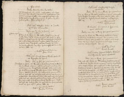 Pro memoria. Actum Anno Domini 1612. Jan Willems Ick ondergescreven etc. ut supra, dat Jan Willems inde tegen woordicheyt van Eerw. h. Sacrament heeft bekent ende beleden ontfangen te hebben ende rechtelyck schuldich te syn willem willems van Buel synen vader, die somme van drie hondert gulden. Aldus geschiet etc. Testamentum Wilhelmi Judoci et Cornelisz uxoris sua infirmautis. Actum anno Domini 1613 23 January horam decima matutina habent copia Inden naem etc. Bijden etc. Maecken sy Testateuren voors malkanderen d'een den anderen reciproce drie deelen die haer Testateuren voorsz toecomende syn wt drie verscheyden beemdekens het eerst gelegen aenden ouden dreyboom, twede genoempt die ende verborsde weye, aen haens aert van donghen het derde dat den lancxtlevende van beyde haeren eyghen wil daer mede sal doen. Alle etc. Lenaert Henricx Testes Peter Dems Testamentum Cornelij Joannis Meussen egrotantis et Thruyken sue uxoris Actum. 1613. 15. feb. horam prima pomeridiana. finen et Byden innehouden etc. Maecken sy Testateuren voorsz malkanderen deen den anderen reciproce, alle die goederen te minderen ende meerderen nae den lancxtlevende beliefte. Item noch maecken syt Testateuren voorsz Mensken haere beyder wettelycke dochtere wesende simpel ende ombequaen om haeren cost te winnen, voor wt een ackerken groot ontrent twe loopensaet gelegen byde tongerlooense hoeve ende oock noch een hondert gulden voor wt, ende sal oock noch so diep deylen als danderkynder. Item noch maecken sy Testateuren voors. Neelken haere dochtere eens voor wt dertich gulden, ter oorsaecken van haeren getrouwen dienst aen haer ouders gedaen. Alle etc Cornelis Jan Willems Testes. Jan Jan Henricx Testamentie Heylken wyt vreyssen egrotantis. Actum Ao. drij 1613 2 Martij hora. 4. pomeridiana Inden. Ach Byden et. Maeckt sy Testatrice voirscreven dat vreyssken haere dochter seventhien gulden voor wt sal hebben, ende dan sullen die kynderen voorts altesamen even diep deylen Alle etcz Wyt geraerts Testes Thonis gerarts. Testamentum Johannis Joannis, et Johannae suo uxoris egrotantis Actum anno. 1613. 10. Marlij hora quarta pomeridiana. Inden naem etc Bijden etc. Maecken sy Testateuren voirscreven malkanderen, deen den anderen reciproce alle die goederen die sy Testateuren voirsz hebben haefflijck ende erfflyck dat den lancxt levende van haer beyden die s goederen sal moghen minderen meerderen, tot synen behoeff. Alle etc Corst Jan Denis Testes Simen Jacobs. Testamentum Johannis Wilhelmi Mutsarts et Catharina suy uxoris en grofantis. Actum. 1613. 11. Martij. horâ 4. pomeridiana. Inden naem etc Bijden etc. Maecken zy Testateuren voirscreven malkanderen d'een den anderen reciproce, dat den lancxtlevende sal in tochten besitten het erffenisse metten huys, daer sij Testateuren voirscreven nu tegenwoordich woonende in syn ende eest saeck dat den lancxtlevende niet wederom en komt tot den houwelycken staet sal dan die voorsch goederen moghen minderen eest saeck, dat den lancxtlevende van doen heeft. Maer eest dat den lancxtlevende wedero compt te houwen, en sal die voirscreven goederen dan geensins moghen minderen dan alleen in tochten besitten synen leeffdaech lanck. Alle etch Adriaen Gogaerts. Testes. Peter Ariens
