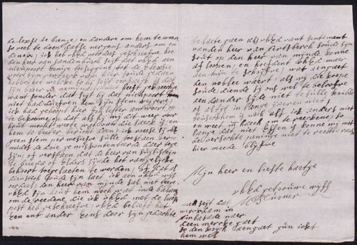 de lexsi te brenge, en dandere om hem te weere so veel te doen datse nergens anders om en deneke, ick heb uhEd voordees geschreefve hoe den heer van sandenburch seijt dat uhEd aen nieupoort Eenige toeseggine, tot de Elexsie voort sijn vertreck van hier soude gedaen hebbe, het welcke so hij seijt oorsaeck is dat sijn broer de nomijnaesi niet heeft gekreechge want sonder dat seijt hij dat nieupoort hin niet had durfven hem sijn stem weijgere, ick had gehoopt hier Een letter antwoort op te bekoome, op dat als hij mij dit weer voor hout mocht weete wat van die saeck is, en hem te beeter bericht doen, ick vreese sij uhE geen stem permesiefve sulle toestaen ver¬ midts de drie gemiskontenteerde daer tege sijn, of verstaen dat de heer van suijlisteijn te breeda of Elders sijnde het van gelijcke behoort toegelaeten te worden, of dat al dienstich soude sijn laet ick aen uhEd wijl oordeel, den heer van mijnde sal niet teege uhEd sijn hout hem noch wat inde balan om de reedene die ick uhEd met de laes post heb geschreefve, uhEd belieft het Een ent ander Eens door sijn gedachte te laete gaen als uhEd vant sentiment van den heer van Aertsberch soude sijn kout op den heer van mijnde konne af loopen, en hoefdent uhEd maer aen mijn te schrijfve, wat aengaet den noblee waert, als wij die koope soude, diende sij ons wel te beloofve aen dander sijde niet te sulle kribbe of altijt in lange ijaeren niet beuseckhom is noch als ick anders niet en weet inde haech om te reeckene, so lange dat niet Effen is konne wij met de versochte peninge niet te rechte raeck hier meede blijfve Mijn heer en lieste hartge uhEd getrouwe wijff M Turnor men seijt dat werckdam in Ambasade naer deen mercke gaet so den krijch aengaet gun ickt hem wel