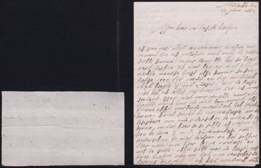 Middachte den 22 ijuin 1667 Mijn heer en liefste hartge ick sien vast uhEd aengenaeme briefve int gemoet die ick geloofve noch met de postin sulle koome, maer dewijlle het so laet wert derfve ick niet langer met schrijfe wachte want se haest alse koomt so seer datse geen tijt geeft en tis middach uhEd laeste is vande 7 deeser, met de laeste post heb ick alles geschreefve dat ick weet seedert isser niet voor gevalle vant wt= trechtse werck hoor ick niet Een woort als tgeene uhEd voorleede maendach heb gescheeve hoe men kapel soeckt te perswadeerse om te desesteere van inde riderschap te wttrecht te koome, om dat haer so se selfs afgeefve al leen te doen is om de augementasi vande riderschap te niet te doen en het selfve daer naer, nae haer Eijge vantasij en wil te sette, uhEd sult met de laeste post twee briefve van mij doch van verscheijde datems krijge, ick had vandaech gemeent