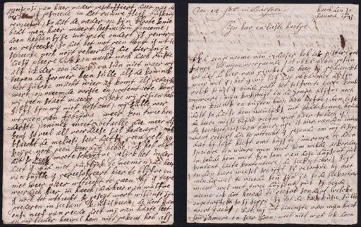 preesensi van haer vader geschoffeert daer nae de borsse afgesneede in dat ranwe fleijl buskruij¬ gevreefve, so dat de vader op sijn bloote knie¬ badt men haer maert leefve sou beneeme, doen hebben sijse int wate ondert ijs geworpe en gesteecke, so dat het met geen tong is wt te spreecke noch noijt gehoort is die tieranije die sij preege, ick kan nacht noch dach ruste als ick der aen denck, en sien niet waer wij teegen de soomer heen sulle als de koninck met sulcke macht weer af komt als gedrijcht wort, op vreemde vorste en pootentaete kone wij geen staet maecke gelijcke wij gesien heb selfs sijn wij niet bestant, wij sulle voor wtgaen van febrijwa weer Een twee honderd derste peninck moete betaelle die meer als Eens so veel als voor deese sal bedrage, noch klaecht de meliesi seer dat sij geen gelt krijge noch geen kreedit hebbe, ick heb uhEd Eens moete schrijfve gelijck het inder dit so weecke daet is bid niet qualijck te neemen, de heer van suijlle is gereesolveert hier te blijfve en niet weer naer wttrecht te gaen hij is teege woordich hier inde haech, den heer van wulfve is noch tot wttrecht so geseijt wort willense sijn goederen in seelant konfiskeere, de doot van ons neef van reede doet mij van harte leet en vrij leeder hoewel hem niet gekent heb als haech den 30 rec. 14. feb. in Brussels, ijanwa 1673 Mijn heer en lieste hartge uhEd aengenaeme vande 17 deeser heb ick gistere ont fange, wt mijne voorgaende sal uhEd hebbe gesien hoe dat de heer van ginckel de heer hij gedanckt weer wel is, het is mij lief dat uhEd met al sijn volck so wel is bidde godt het selfve te laete konti¬ niweere, mijn kockmeijt en de jonge blijfve noch Even kranck en buijten hoop van leefve, den leste dolt so datse hem naulijcks int bedt konne houde de heere wilse beijde geefve wat haer salich is, de seeckretaris van Ameronge is hier van den inten¬ dant robbert die te wttrecht is gesonde om mij te sege dat hij last heeft omt huijs te Ameronge te doen springe ten waere men met hem wilde ackordeer en soude hem met Een som van drije duijsent gul kontant laete kontenteere, de seckretaeris seijt en den heere weesel schrijft sij geloofve hij met minderwel te vreede sou sijn ija so de seekretaer meent wel met twee duijsent gul sij beijde meene ick dit hoorde te geefve sondert welcke ongetwijfelt so sij segge sij tot de Exsekusie sulle voort gaent, dat mij int binenste van mijn hart sou jamere en seer doen, weet niet wat ick doen