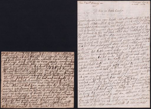 dat so haest de prins hier komt hij Een voet val wil doen en biade groote papa thuijs mack koomen, maer dat deseljfe ondertusche ock sou schrijfe en versoecke het selfve , ick hebt hout int bos opden geheelle heijmen ber ver¬ kocht voor 850f dat sij in twee ijaere moeten hout we doch de geheele kooppeninge sint ijan Eerskoo mende moote betaelle, het hout is so de seeckretaris seijt doord franse seer mishouwe, ock heb ick Een gedeelt te vant hout onder de vordel en Een perck aen ijanvan weelees berchge verkocht voor 350f saem, so dat wij dit ijaer vant verkochte hout hebbe te ontfang 1200f, Elck seijt dat het heel wel verkocht is, deese dach heb ick de reecknin van teminck tot den 6 deeser ontfange waer hier neffens de kopije gaet daer uhEd wt sal sien waer aen hij de ontfang peninge weederom heeft wtgegeefve, alles loopt hooch¬ men denckt het niet en alsme de reecknine siet bevinde ment, nu is de wage of koetse wech so breet als de pijlaers vande bruchge van een koome te staen, oet kleijne voorburch met peuijn en sant daer over aen gehoocht soot weese moet, hier meede blijfve Mijn heer en lieste hartge uhEd getrouwe wijff M Turnor de heer van ginckel is twtrecht op de paerde mart die deese avont hier verwachte Ameronge den 2 rec. 10e. Martij maert 1680 Mijn heer en lieste hartge naert afgaen van mijne laeste, tot wttrecht noch sijn is den heer van duijckenburch bij mij geweest die ick uhEd schrijfvens weegens het reeckenmeester amt heb gekomuniseert, dewelcke noch bij sijn hEd voorgaende segge perseesteerde, dat is dat hij seijt te vreede te sijn int geen uhEd hier in belieft te doen en dat wenste deselfve daer van gedispooneert hadt docktoor straete was bij hem geweest, ent selfve Amt voor so veel als sijn hEd aenpart was, van hem versocht dan had hem geantwoort daer buijten uhEd niet in te wille doen, wat belanckt het werck van berck en wellant het Eerste meent becker dat haest sal konne afgedaen sijn waer toe hij belooft den prockereur aente sulle maenen, tot het ander heeft wellant noch acht maende tijt, Eer hij de kapitaelle hoeft op te brenge, hoe wel hij belooft heeft van tijt tot tijt die te sulle aflegge geschiet daer niet van, ijae selfs voldoet hij de rente niet het derde ijaer rente loept die hij van Engelen schuldich is en de weeduwe vande pander de roij heeft mij door beusekom ock weer doen aenspreecke klaecht dat breeijeerijus van sijn