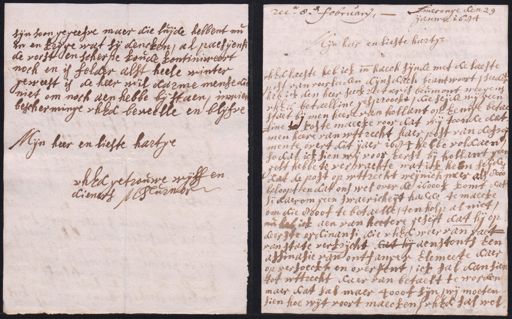 sijn soon gegeefve maer die luijde hebbent nu in en krijge wat sij dencken, al paesijensi de vorst en scherpe koude kontiniweert noch en is felder alst heele winter geweest is de heer wil darme mense die niet om noch aen hebbe bijstaen, iniet bescherminge uhEd beveelle en blijfve Mijn heer en lieste hartge uhEd getrouwe wijff en dieners MTurnor Ameronge den 29 rec. 8e februar. ijanwa 1684 ijn heer en lieste hartge uhEd laeste heb ick inde haech sijnde met de laeste post van voorleeden dijnsdach beantwoort, seeder heb ick den heer seeckreetaris beumont weegens uhEd betaelline gesproocke, die seijde wij geen staet bij men heere van hollant op Eenige betae line so koste maecke voor dat wij toonde dat men heere van wttrecht haer post van degroo mente overt dit ijaer 1684 hebbe voldaen, so dat ick sien mij voor Eerst bij hollant geen gelt hebbe te verpwachte wat isk hem seijde dat de post op wttrecht weqnich meer als 8000 beloopt en dat ons wel over de 16000£ komt dat sij daerom geen swaericheijt hadde te maecke om die 8000£ te betaelle, ten holp al niet nu heb ick aen van heetere geseijt dat hij op deerste ordinansi die uhEd weer van raeck van state verkrijcht dat hij aenstonts Een alsinasie vande ontfanger Elemeete daer op versoeckt en oversent, ick sal dan sien tot wttrecht daer van betaelt te worden maer dat sal maer 4000f sijn, wij moeten sien hoe wijt voort maecken, uhEd sal wel