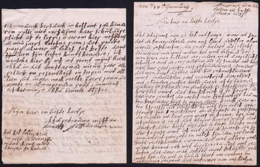 tis van daech kersdach in hollant, de kinde ren wille net versuijme haer schuldige plicht af te legge, waerom hier neffens de nieu ijaers briefve gaen, dat groote papa alweer inde beurs sal koste dant sijn tis aen sijn liefve kintskindere, ick wensche hier bij ock wt gront mijns harte uhEd in dit aenstaende nieuw ijaer alle geluck en gesontheijt en seegen niet als leen dit maer noch veelle ijaere, van die groote en almoogenden godt, inwiens bescherminge uhEd beveele blijfve Mijn heer en lieste hartge uhEd getrouwe wijff en dieners M Turnor het sal bellegarde om gelt te doen sijn want kant niet langer so houde Ameronge den 22 rec.a 10.e Januarij deesem en Eerste ijanwa 1683 Mijn heer en lieste hartge uhEd schrijvens vande 21 heb ontfange, waer wt sien dat de swaericheede van ons lant deselfve alme worde geschreefve, die godt beetert dagelijcks toeneeme wie weet waer het noch belende sal men heere van hollant vergadere noch daegelijcks behalfve noch de vergaderine die bij sonder int huijs vande heer raet pensinaris gehoude werde, sonder, dat men hoort datter noch Eit gekonckludeert wort, ondertuschen gaet vranckrijck daegelijxs met plundere roofve heelle dorpe afte brande vrouwe te schende en dochters te schoffiere so hoorijbel voort dat Een schrick is te hoore, de heer van ginckel die verlof van sijn hoocheijt had om Een keer naer huijs te mooge doen kreech daer op van mardies doen mdene Een Espresse die versocht hij met sijn volck aenstonts sou s marscheere om de franse te reesisteere die trachte int lant van waes te koome, hoe dat afgeloope is en of dat kleijne hoopge volck dat ginckel daer heeft bestant is teege sulcke macht der franse weet ick niet, dat de spaense die so onmachtich van gelt en volck sijn den oorlooch heeft gedeklareert verwondert niet alleen veel maer konent ock niet begrijpe, en doet veel geloofve dat daer wat achter moet schuijlle godt weet het die wel te bidde staet om vroome en getrouwe reegent diet welvaere van ons liefve