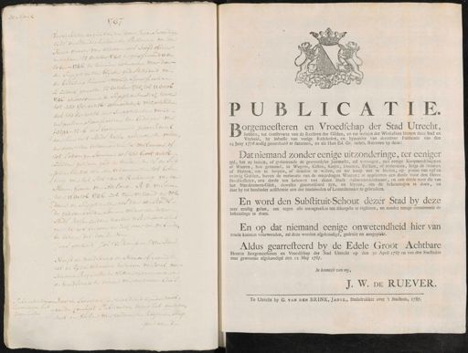 30 April 1787. Vereischte acquiten en door Jegenswoordige tijds omstandigheeden de Rekening van den Heere Grave van Athione, als hoofd officier ingegaan 12 October 1785. en geëxpireerd 166e tober 1786 te kunnen formeeren, waar door de Supplianten blijven gedestitueerd van de betaling hunner voorsz: Specificatien 't zederd gemelde 12 October 1785. tot 11 Octob 1786. alwaaromme de Supplianten zich keeren tot ued Gr: achtb: ootmoedelyk verzoekende dat uid Gr: achtb: der Supplianten voorsz: — respective specificatien ten bedragen van ƒ3294 —12–8 als bovengemeld, provisioneel aan hun uit stads kassen gelieven te voldoen en daar toe ordonnantie te verleenen, of tot sodanige somme als uEd Groot achtb: zullen gelieve goed te vinden, mits de sup¬ =pliante zoo ara de ordonnantie tot beta =ling van het slot van de Reekening van den Heere Grave van Athlone R: O: verschee nen 11 Octob 1786. zal zijn verleend en vol =daan; de Supplianten als dan aanstonds— de geävanceerde Somme weder aan dezer stads Kassa zullen moeten restitueeren, het geen zy ook beloven en zich daar toe verbinden bij dezen, dit doende & /was getekend/ Joh=s Oskamp en J van Dam. Heeft de Vroedschap de Heeren Gecomm tot de Extra ordinaire uitgaven versocht voor schreve Requeste te Willen examineeren, en de Vroedschap te dienen van derzelver advis Publicatie tegen het omlopen, met Kooprunspr Door de Secretarissen ingediend zijnde, navol= gende Consept Publicatie tegen het omlopen met en veilen van goederen en koopmanschap =pen aan de 10 A C I 1 4. orgemeesteren en Vroedschap der Stad Utrecht, hebben, tot conservatie van de Rechten der Gilden, en tot welzyn der Winkeliers binnen deze Stad en 40 2 Vryheid, by inhasie van vorige Resolutien, en byzonder van derzelver Publicatie van den 24 Juny 1776 nodig geoordeeld te statueren, zo als Hun Ed. Gr. Achtb. statueren by deze: Dat niemand zonder eenige uitzonderinge, ter eeniger tyd, het zy buiten, of geduurende de gewoonlyke Jaarmarkt, zal vermogen, met eenige Koopmanschappen of Waaren, hoe genaamd, in Wagens, Kisten; Kasjes, Doozen, Pakken, of anderzints, langs de Straaten of kluizen, om te loopen, of dezelve te veilen, en ter koop aan te bieden, op poene van vyf en twintig Gulden, boven de verbeurte van de omgedragen Waaren: te appliceren een derde voor den Heere Houfdofficier, een derde ten behoeve van dezer Stads Aalmoesenierskamer, en een derde voor die van het Marskramers-Gildt, dewelke geautoriseerd zyn, en blyven, om de bekenringen te doen, en daar by tot hunlieder adsistentie een der Stadsboden of Letterdienaars te gebruiken. En word den Substituit-Schout dezer Stad by deze zeer ernstig gelast, om tegen alle transpressien ten scherpste te vigileren, en zonder eenige conniventie de bekeuringe te doen. En op dat niemand eenige onwetendheid hier van zoude kunnen voorwenden, zal deze worden afgekondigd, gedrukt en aangeplakt. Aldus gearresteerd by de Edele Groot Achtbare Heeren Borgemeesteren en Vroedschap der Stad Utrecht op den 30 April 1787 en van den Stadhuize naar gewoonte afgekondigd den 12 May 1787. in kenise van my, J. W. OE RUEVER. Te Utrecht by G. van Den BRINK, Jansz. , Stadsdrukker over 't Stadhuis, 1787.
