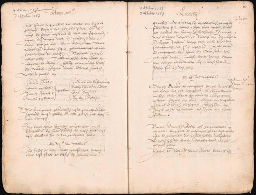 Anno XB. 4 occtober 1587 7 october 1587 mit dselve te procederen tot electie van drye a persoonen, bequaem tot gelycken staet, ende de namen der selver neffens de naem van Jegenwoordige Hopman de Magestraet In geschrift ouer te leveren voor xy uren, omme byde Magistraet daerwt ende nyeuwen hopman geromineert oft een oude gecontinueert te werden, Twelcke zy alsoe gedaen hebben. Ende gesien byden Roide de overgeleverde cedullen, hebben gecontinueert Claes van Leuwen, Reynier Vereem, Gerrit Fransz Ende In plaetse van gestelt Henrick Jansz Henrick gysbertsz Werner Jacobsz Cornelis gysbertsz Fredrick van Schonevelt Willem thomasz van Well Cors Jansz Jan van Metken. De Nye gecoorle gecomitteerden ofte gecontinueerde hopluyden voirs hebben den eedt gedaen Inde voors acte begrepen. Syn boorts eselve hopluyden geauctoriseert om de beuelhebbers van hoere Vendelen te mogen continueren ofte veranderen soe hy dat goetvynden sullen. den vijen. Octobris Op huyde es byden Rande geresolueert datmen omme dese stadt te versien van genruchsame 153. 7 oktober 1587 9 october 1587 Lxxxvij. Garnisoen garnisoen, ende t' ontlasten van overtallich garnissen solliciteren sall datmen alhyer soude moghen houden van tendel van Hopman Cleerhagen i L. coppen noch de twee Engelsche Vendelen van wynckfelt ende Rogier Willems diemen elcx oock soude doen sterckmaken tot io. l. coppen, ende datme de compaignie van Hans van Loo soude doen gaen opde vaert, Ende boorts dat men dit deur eenige gecomitteerden de Maerschalck Pelhum sal aen doen geuen. den ixen. Octobris extraorens Impost opt Coort. Om een ordonnan te concipieren van een Impost opt Coorn tot het logysgelt ende extraordinaris oncosten vande Stadt te veruallen, Syn gecom„ mitteert henrick van Riet, Gerrit van dompselaer ende Jacob de Ryck Schepenen, Gysbert van Voorst. eerste Cameraer ende Johan van Hemert Randt Vincent Winrentsz Raedt es gecommitteert om een maent lognsgelt te ontfangen ende te distribueren onder de gemeente die gehadt hebben die Vendelen Engelschen, die voorde Jegenwoordige alhyer gelegen hebben. Henrick de Velr Is sitteus Raets belast den