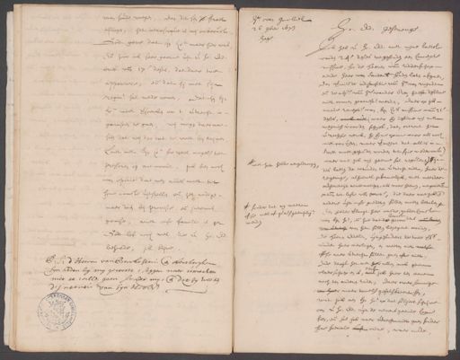 man soude voegen; Dan dit sijn de straet tijdingen, het intrinsicque is mij onbewust, Godt geve dat sijn Hoogheijt maer hier was Ende hoor ich seer geerne uijt u hoogh Edele brief vande 17e. deses, dat daer toe apparentie; ende dat hij met sijn regiment sal mede comen; Dat hij sijn hoogheijt moet versoecken om t‛ utrecht in garnisoen te gaen. wij mogen daer nae- sien dat wij der dat te voet bij krijgen: Laet niet sijn hoogheijt soo veel mogelijck te presseren op antwoordt, ick ben noch van opinie dat men alles moet tot sijne comste uijtstellen ende het nodige maer doen bij provisie, ende interims gewijse; met onse famille is het Godt lof noch wel die u hoogh Edele behoede, ick blijve P.S. d'Heeren van Berckestein ende Aersberghen sijn heden bij mij geweest, seggen naer utrecht niet te willen gaen sonder mij, ende dat sij weeten d‛Intentie van sijn Hoocheijt G. van Ginckel 26 november 1673. hage # niet goet hebbe aengedronge # sonder dat wij weeten ofse wel of gualiteijt geemploieeert werden. Hoogh Edel gestrenge Ick heb u Hoogh Edele met mijne laetste vands 24e. deses toegesonde een Concepte missive, soo de heeren vande ridderschap aende heer van Sandenburg souden laten afgaen Dan vermits de indispositie vande Hr. van mijnden en de absentie. vande hr. vander Aa, heeft deselve niet connen gearresteeert werden. Daer op ick naede receptie. van sijn hoogheijts missive vande 21e deses, oock niet (waer bij deselve mij met weijnich woorden schrijft, dat, ontrent het Utrechtse werck, hij sijne opinie voor als noch niet can uijten, maer vermeijnt dat alles in- Staet moet gehouden worden tot sijne wedercomste) waer nae ick mij geerne sal reguleren. # in- des laeten de vrunden tot utrecht niet, haer de regeringe, alhoewel informelijck, met meerder authoriteijt aentematigen, als voor heenen, negocieren op ende tot laste vande proeve, die daer nae ick ende andere uijt onse goederen sullen moeten betalen# Een ijeder verlangt hier mede weder comste van sijn hoogheijt, ende hoe dat dit bewust gecomen. van sijn ho.t., ende hoe dat die gecomden. van aecht van hem sullen bejegent werden. De heeren Edelen, uijtgesondert de twee ver.... vinden haer verlegen en weeten niet watse off se naer Utrecht sullen gaen ofte niet ende dewijl het met her allen oock geen claerschaep en is, derf ick haer ten eenen noch ten anderen raden, daer over sommige van haer maer taemelijck gesatisfieert sijn, wat ijck aen sijn hoogheijt op dat subject schrijve can u hoogh Edele uijt de nevens gaende Copie sien, ende sal ick naer utrecht niet gaen sonder sijne speciale Last ordre, waer mede