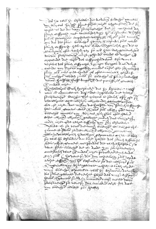 Des zoo will hy testateur dat die voorn tverige cornelis van vryens huysffs sijne suster nijet tegenstaende die sij ionger is dat die voorn. serastiaentge dat sy nochtans den selven erffpacht nae toverlijden van hem testateur verheffen sall ende principale emphileete wesen ende blyve sall willende oock dat die selve tventge hebben ende behouden sall aende selven erffpacht heur optie kuer ende gelieven om die te geeruycken ofte verhuygen soo als huer dat gelieven sall twelck selastiaensge altijt gehoude werdt te volge ende angaende die laste des erffpachts voornt tsij vant versouck des selven erffpachts, van het Jaergeke daer vuyt gaende van dycke ongelden onrade laste ofte schartigen sulcx als nue opde lande es ofte namaels geseth sall muege werden sulle sy tvenkge ende selastiaentgen voornt halff ende halff dragen ende die prouffyte gemolen ende anders nijet Beheltelyck ende vuytgesondert dat hy testateur noch will ende ordonneert by desen dat ingevalle die vooren sebastiaertge tenijge uijt quame te sterven tsij oft sy wettelycke echte blijven blyckende geboorte achter ket oft nijet dat alsdan die helfte van selven erffpacht heur aldus gevraect erve ende gae sall alleen opde voorn tventge cornelis van Roijecis huysfrou ofte heure echte blyven blycken geboorte indien daer enij gesijn indien nijet op de rechte erffgen. van sijn testateur Ende by soo verre die voors tventge tot enijger tijt quame te sterve sonder blyven blycken geboortenckx heur in witkelycken huwelyck geprocreert achter te laten soe will hij testateur dat dese helfte des selven erffpachts heur alhier gemaect melfgaders die wederhelfte (soo verre heur tventge die by doode van secustiaenlgen anbestorven ware ende anders nijet succedere erven ende gaen sall (zoo verre sy die dan achterlaten sull) opde rechte erffgen van he testateur soo dat behoore sall ende ingevalle van echtergeboorte achter betalen by de voorn tuerege geprocreert vlill hy testateur dat alsdan die selve geburte die rechte helfte des voors erffpachts hebbe ende geniete sullen in manieren voors mette voorn sebastiaenige soo verre sy dan int leve es ende den doot van tuentge beleeft sall hebben