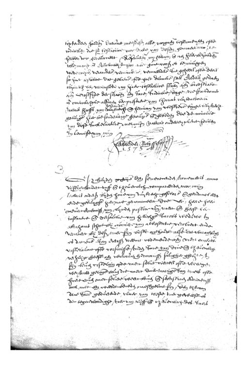 textenderen houdende daerome metsdesen alle voorgaen testamenten ofte codicillen die sy testatrice voor date van desen gemaect mochte hebben voir gerevoceert Reserveren mye kennen ende aen huer behoudende volle macht ende Auctoriteijt van acker gunt voors es te muegen wederroepe, verandere, verminderen, vermeerdere Int geheell ofte deelt soo haer testatrice dat gelieve ofte goet duncke sall Aldus gedaen kuytrecht ten vroenstede van huer testatrice staende aende breestrate aen Oostsyde der straten ten Jaren Judictie, dagen, vre spandoms ende coninckrijcke alsvoren ter presentie van thomas vuytenbroeck zellandt Notaris Thooffs, van vuijkoecht ende herman van westrene borger tuykrecht getuyge hier toe sonderlinge geroupe ende gebeden die de minute van dese Inckenature met mijn notario onderteyckent hebben mijn herwaerden Notaris Op huyden xxviie den seventienden novembris anno vijftienhondert vyff ende tzevertich compareerden voor myn Notaris onders byden hove van vuybrecht geswore ende geadmitteert ende getuyghe hiernae genomineert doestr heere heer Evert Antonisz van lynden pastoor vande vaert ende heeft ter instantie ende versoucke van hillichge Jacobs weduwe in abrahams schoot bij maniere van attestatie verclaert ende verclaert bij desen naer sijn beste onthoudt alse dat warachtich es dat ene Jan Aerissen vreemt woenende aen vaert omtrent vastelavont ofte corsmisse inden Jare van drie ende tzeventich verhuijrt heeft aen walraven hermansz saligher ghechte in sijn leven castelain opde vaert seker viertell ofte weertgen weylants gelege boven die vaert daer marijge Jan maels ofte huere erven met sekere weert boven ende sebastiaen Adriaensz oock met een weerdt beneden naestgelint sijn, den tijt van drie jare geduerende waer van tleste jaer geweest es dit tegenwoordighe jaer van vijff ende tzeventich des jaers