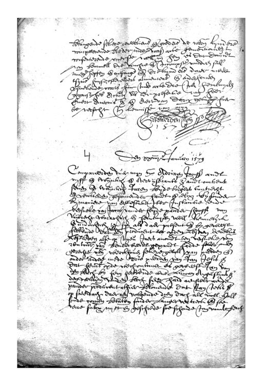 betangende sekere rentebrieven ende goedere die voorn. kyndere competerende breder inde voors acte gementioneert consenterende overste veell in hem es dat Davidt van bemmell die vruchte ende incompste van dien sall mege heffen ende ontfange ende die kyndere daer mede tsyne huyserste elders alimentere ende onderhouden versuekende voorts huic inde acte die Ick hemluyden gegaist heb Actum vls ter presentie van heer Evert Antonisz ende Aert van Darn getuyge hier toe versocht in kennisse van myn Den xxiiijen January 1579 verwaerden nots. Compareerden vuer myn etc Adriaen Janssz andt vyff ende twynlich ende Aertijsbrants z andt omtrent seven ende twijnlich Jaren beyde borgers tuytrecht ende verclaerden gesamender handt ende elcx bysonder by maniere van Attestatie ter instantie ende versueke van Jacob vander heijde pander shooffs van Vuijtrecht warachtich ende hemluyden well kennesyck ende indachtich ten syn als daer present ende by geweest hebbende dat een producent ter opden lesten decembris lestleden alse op nyeu jaers avondt ten versueke vande rentmr van beveerbeerdt gepandt hadde selve inden gerechte van werckhoven sekere getall van peerden ende onder andere mede drie peerden van Jan Jelisz dat hemlieden opde werhoutmeer es geweest Jan van den berch by hem hebbende ene Luncan Augustynsz den welcken vanden bloch seer hard aensielt aende pander producent alhier belovende dat Jan Ielisz op saterdach daeraen volgende dien dach all voll ende all soude comen betalen sonder langer vertreck ende soe verre sulcx nyet en geschiede soe schoude Jan vande ber