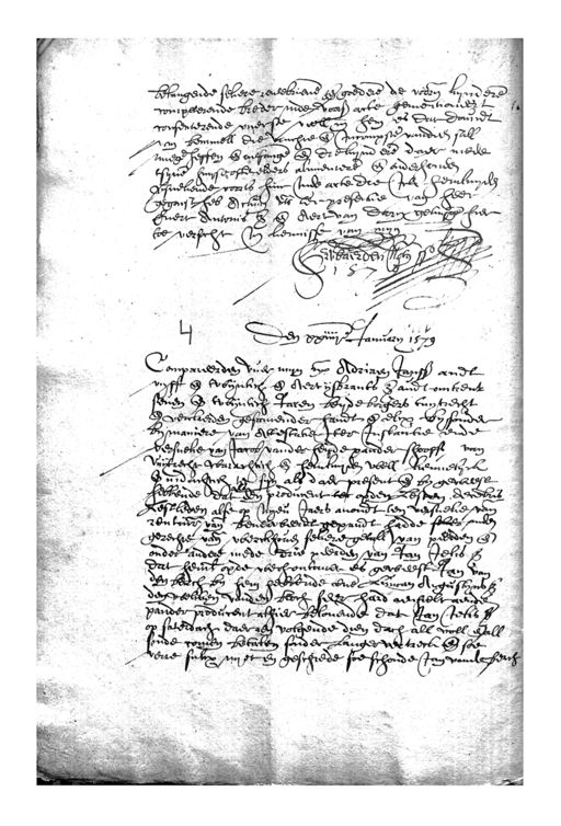 belangende sekere rentebrieven ende goederen die voorn. kynderen competerende breder inde voors acte gementioneert consenterende overste veell in hem es dat Davidt van bemuell die vruchie ende incompste vandien sall nuege heffen ende aefange ende die kyndere daer mede tsyne huyserste elders alimentere ende onderhouden versuekende voorts hun inde acte die ick hemluyden gegaist heb Actum uts ter presentie van heer Evert Antonisz ende Aert van Darn geluyge hier toe versocht in kennisse van myn Den xxiiijen January 1579 verbaerden nots. C Compareerden vuer myn etc Adriaen Janssz andt vyff ende twynlich ende Aert ijsbrants z andt omtrent seven ende twijntich Jaren beyde borgers tuytrecht ende verclaerden gesamender handt ende elcx bysonder by maniere van Attestatie ter instantie ende versueke van Jacob vander heyde pander shooffs van Uuijtrecht warachtich ende hemluyden well kennelijck ende indachtich te syn als daer present ende by geweest hebbende dat den producent ter opden lesten decembris lestleden alse op nyeu jaers avondt hen versueke van rentmr van beverweerdt gepandt hadde seker inden gerechie van werckhoven sekere getall van peerden ende onder andere mede drie peerden van Jan Jelisz dat hemlieden opde werhoutandt es geweest Jan van den berch by hem hebbende ene Luncan Augustynsz den welcken vanden bloch seer hard aenkelt aen den pander producent alhier belovende dat Jan Ielis op saterdach daeraen volgende dien dach all voll ende all soude comen betalen sonder langer vertreck ende soe verre sulcx nyet en geschiede soe schoude Jan vande be