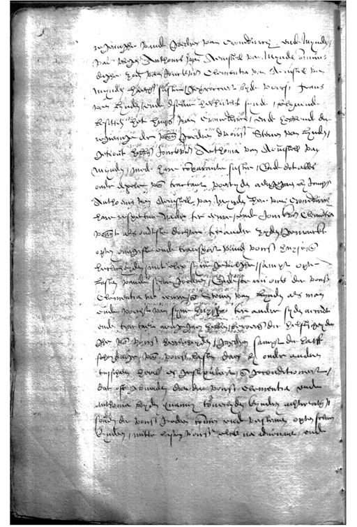 de geringhe vande goedren van crondburch ende mynden van wegen Anthonis van Aemstell van Mynden omme¬ daghe zoen van jonck van Clementia van Aemstel van mynden haerl. suster, geprocreert byde voirs. frans van lynden, ende dselve herhuwel synde, blyvende besitten het huys van crineburch, ende hebbende die „ „ regieringe de vorn. goederen dvoirs Steven van lynden „ getrout hebben Jonckvrau Anthonia van Aemstell van wynden, mede hare comparante sustre, Ende dat alles onder dexele van tractaet voertyden aengegaen ende joncheyt Anthoems van Aemstell van Mynden heren van Cromburch hare respective vader ter eenre, ende joncken clementie voornoemt als oudtste dochter ter andere zyden, gemaeckt opten overgift ende transport vanden voirß huyse ende heclicheyden, mit elcx syne gevolghe sampt opte lasten vande selve goederen, Ende soe nu oick die voirß Clementia tot eenre, ende Steven van lynden als man ende voecht van syne huysfrouwe ten andere syden accodt ende tractaet aengejaen hebben beroerende die helftscheydinghe Ehe waers heerlicheyden, goederen sampt die halff scheydinge van de voirs. lasten daer by onder anderen tusschen hemlieden es inslepuleert ende geconditioneert, dat oft ghevonden dan die voirß clementia ende anthonia beyden quamen toverlyden kynden achterraten souden die voirß goederen commen ende versterven opten selven Enden, mitte lasten voirß elck na advenant, ende ende daer drie twee ende 1