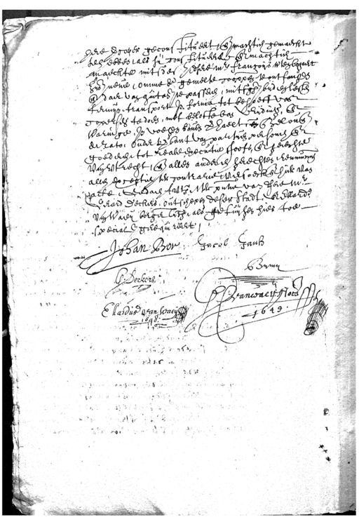 here vercoper geconstitueert, ende machtich gemaeckt te hebben, als sij constitueerde ende machtich maeckte mitsdes zidsere mr francoijs wtenbogaert zoo neve, omme de gemelte cooppen te ontfangen ende daer van quitan te passeren, mitsgaders bij den lesten temijn transport In forma tot behoeff van copersen te doen, met belofte van vrijding, ende Waringe, In voegen boven verhaelt, ende Belovende de rato, onder verbant van partiën personen ende goederen tot reale executie stoofs, ende gerechte van Utrecht, ende alles anderen gerechten, renuncien allen exceptien ter contrarie versoeck ende hier van Tracte. Gedaen folio 7ber pntie. van den M.r Gerard Deckers, out schepen deser Stadt, ende Ellarden van Waeij borger luth, als getuijgen hier toe special ende gerequireert. — Johan Bor Jacob Jansz G. Decker F: vande waer. Nots. Ellardus van Waeij . .. . By my 1649.