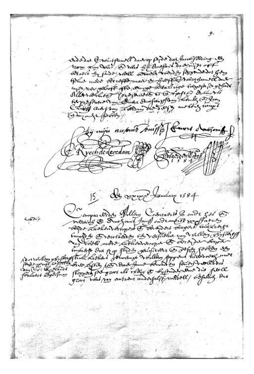 Het Utrechts Archief, archieftoegang 34-4, Notarissen in de stad Utrecht 1560-1905, inventarisnummer 7, Jacob van Herwaerden, Protokol, met indices, 1575-1612, 1584-1585 mrt