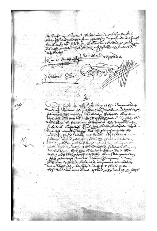 ten huyse mijns notaris staende onder die laekensnyders byder Stadts plaetsche int beweesen van Evert Anthonist van Lienden ende Steven Eller Looffweerdige getuijgen die deesen metten compt ende mij ander hebben ten jaere ende daege Ivert Anthonissen A J.C.I. Stephanus Eller. Daniel va wyngarden Uwaerden Nots. 1584 Op huyden den xvie Januarij 1584. Compareerden vuer myn notaris ter presentie van naekenaemde gebuijgen hier toe versocht bruyn fredericx verwer borger tuytrecht oudt omtrent een ende tsestig jaere tuychden ende verclaerden by forme van Attestatie ten versueke van Frederick brumensz zijne soon Laekenbereyder borge luytrecht warachtich te syn dat hy geruych omtrent een maendt ofte zes weken nae Jacobi lestleden van Frederick bruijne geverfft heeft een stuck Laekens van dertich geerden met dusdinge merckt Int blauw als opde merge van deesen welcke laeken frederick bruynen verclaerden op St Jacobs merckt Anno drie ende tachtich Lese leden gereft te hebben binnen der gauw van eenen genoempt Nicolaes henneliss coopman van Rotterdam welcke laeken den comparant verclaerden dat op verscheyden plaerschen duertheell stuck zeer beheewr was waer duer tselve geen verwe en heeft