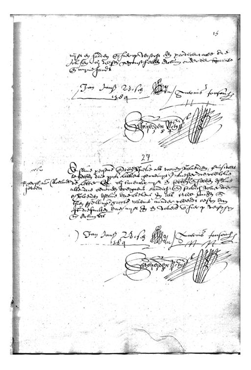 Het Utrechts Archief, archieftoegang 34-4, Notarissen in de stad Utrecht 1560-1905, inventarisnummer 7, Jacob van Herwaerden, Protokol, met indices, 1575-1612, 1584-1585 mrt