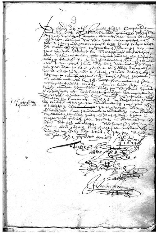 t's ampt ende daer besander Op huijden den xvijen. Junuarij 1642: Compareerden woort mij Nots. ende d'onderbeurende getuijgen Ghijsbert Anthonisz van Viam ende borger, ende metselaer binnen utrecht eijgenaer, ende possesseur zijner enve gelegen aen de west zijde vande Nieuwe graft bij de Pauls brugge naest het erff ende huijsinge van ganck, ende Poortgen van Jacob vry door rentmr van Bartholomeus Gasthuijs, daer den Comparant, een tegenwoordich ene huijsnige nieus op timmeren is. En verclaerde in sijne sij de huiver naest de voorss. zanck den booch daer inne geslagen met gene ander intentie gemaect te hebben, dan op een Casse aldaer In de muer te schiten, Sonder dat hij enghe uijtgang op off recht totten voorss Gangh heeft nu, off naemaels bij hen off sijne naecomers sall mogen gepretendeert worden, dat oock inde selve muer bij hem ofte zijne successeuren possesseurs zijner voorsz huijsinge, niet anders licht geschept sall mogen worden dan volgende d'oudemanten, Constitueren den Comparant voorts Abraham van Karckraet, en Seyde van Achtevelt Proces Gh voorden Gerechte der Stadt utrecht 4 ouijt' zeve voors. is t'allen tyden ende vermaninge gerechiel ze bekennen ende versoecken daer inne gecondemneert te worden, met belofte van weerden te sullen zouden, ende doen houden t'gene in crachte deses gedaen, sall wouden. Onder verbant ende submissie als nae rechten. Versoeckende hier van acte, aldus gedaen binnen utrecht ter presentie van Cornelis van Asch mede Vlots, ende Jan van Schrijck als getuijgen, ghijbert thonissen V: Tertis Jm. Schaick J: v: van Asch my present 1641 F: Carbechodet sen V: Dooch 164 Een Een